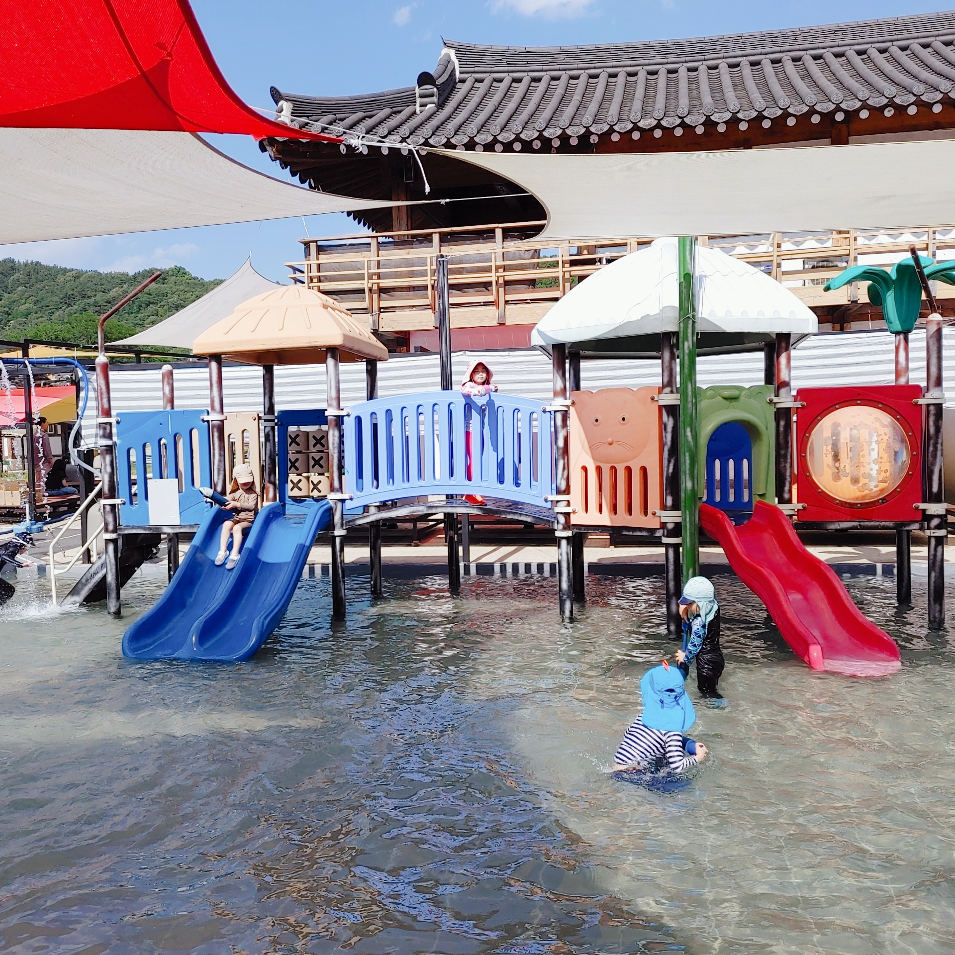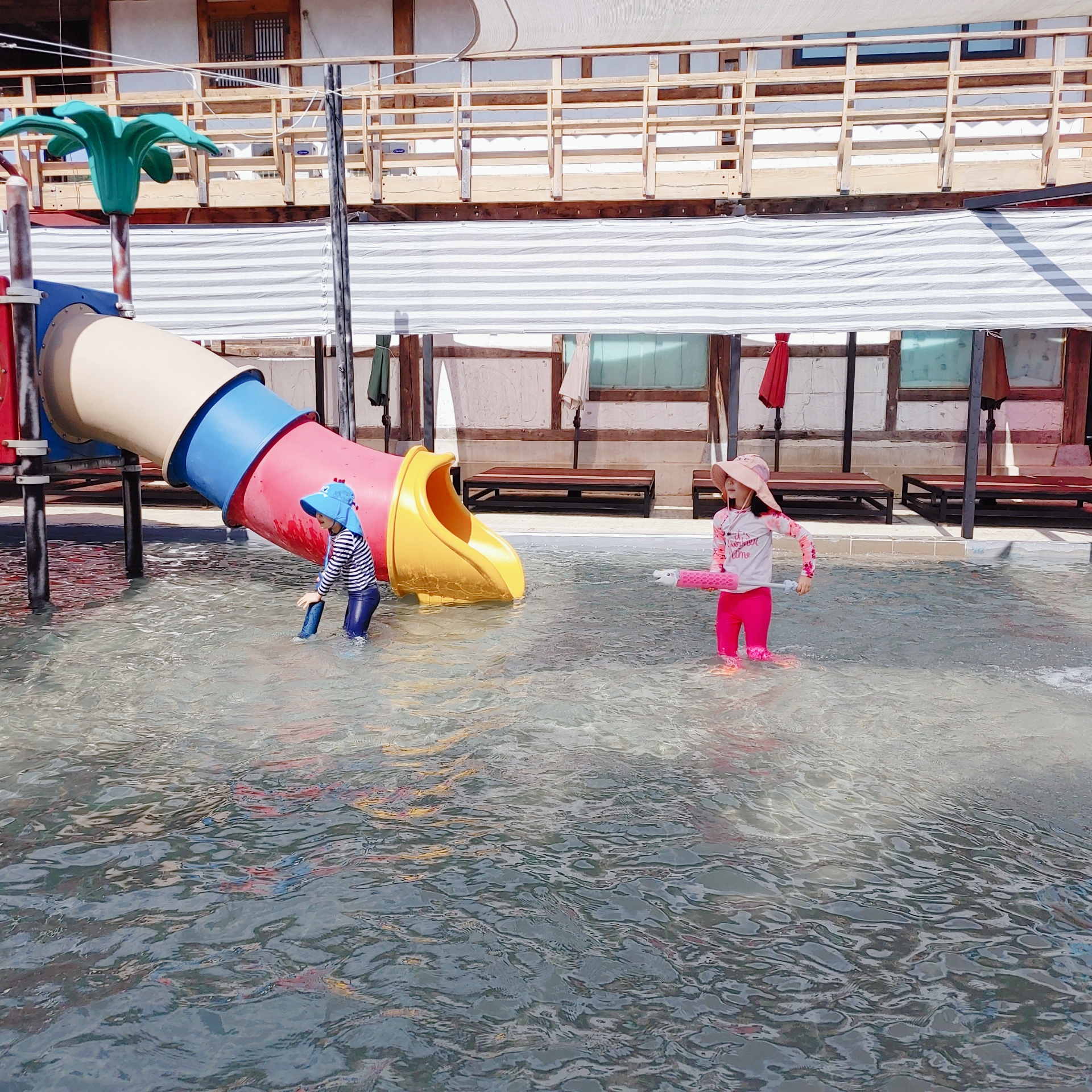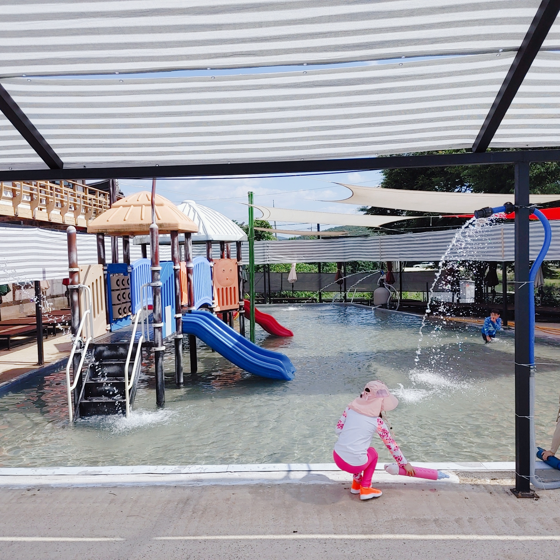 6월 초에는 유아풀장만 오픈을 했더라고요. 유아풀장 위에 그늘막도 있고 풀장 주위에 평상이 설치되어 있어서 어른들은 여기서 아이들 지켜보기 좋았어요. 풀장물높이는 초2기준으로 무릎정도 높이랍니다.