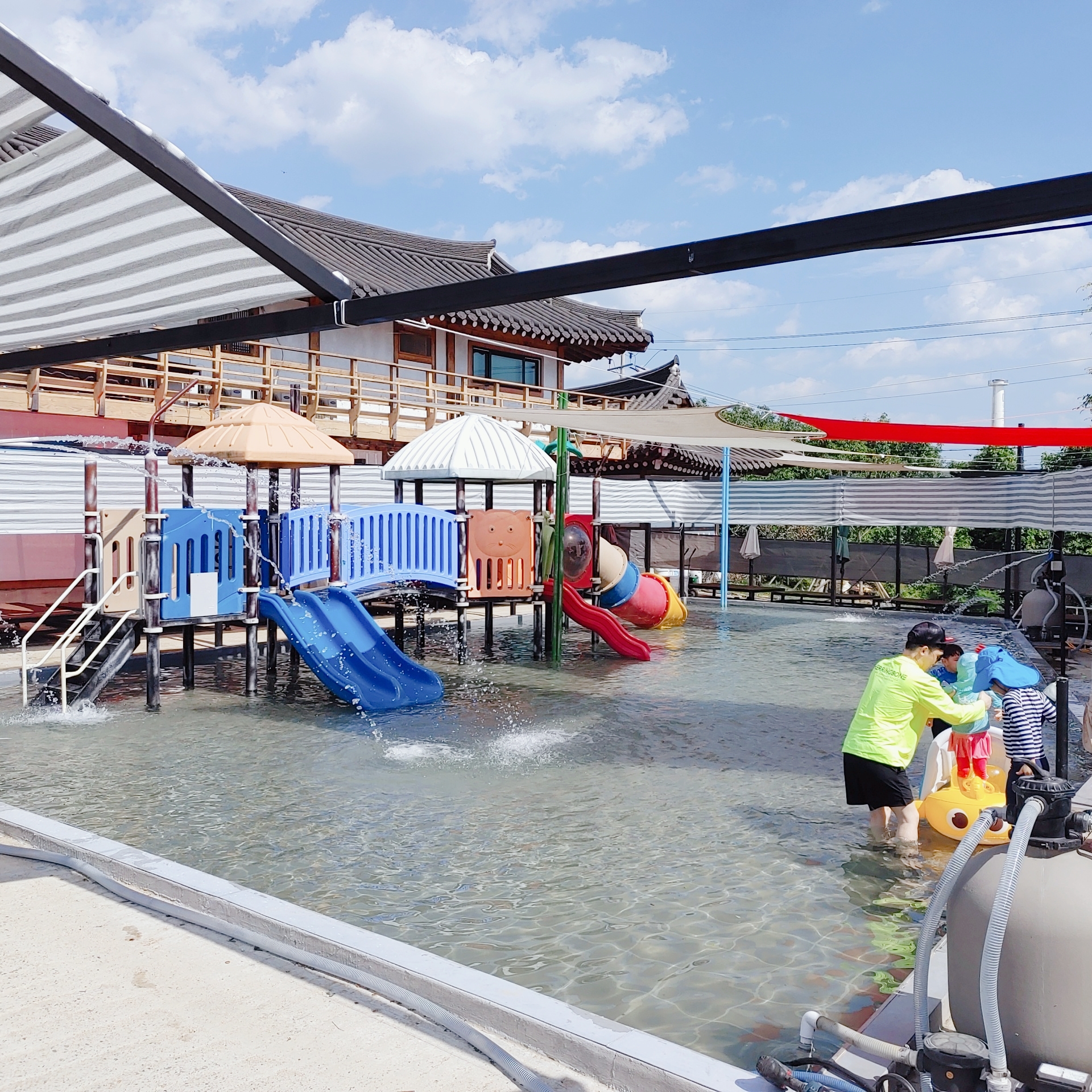 저희가 갔을 때는 아직 큰 수영장은 오픈을 안 했더라고요. 큰 수영장은 7,8월에만 운영을 한다고 해요. 족구장 자리에도 대형 수영장이 설치가 되나 봐요. 수영장 규모가 엄청 크고 유아풀장부터 에어미끄럼틀 성인 수영장까지 있어서 가족단위로 놀기 좋을듯합니다.
