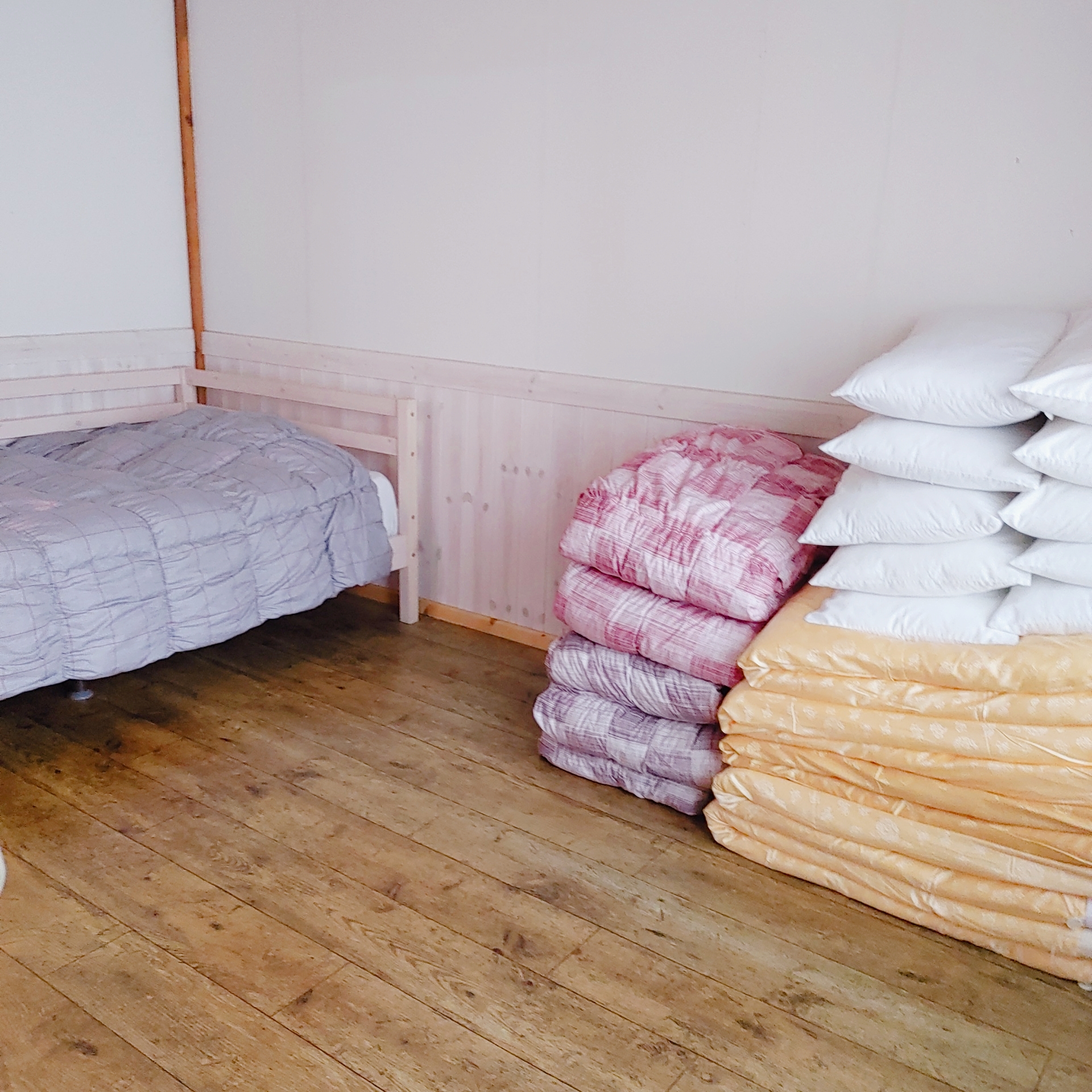 고운재 4번 입구오른쪽 방은 침대 작은 게 들어가 있어요. 그리고 여유분 이불들이 준비되어 있고요.