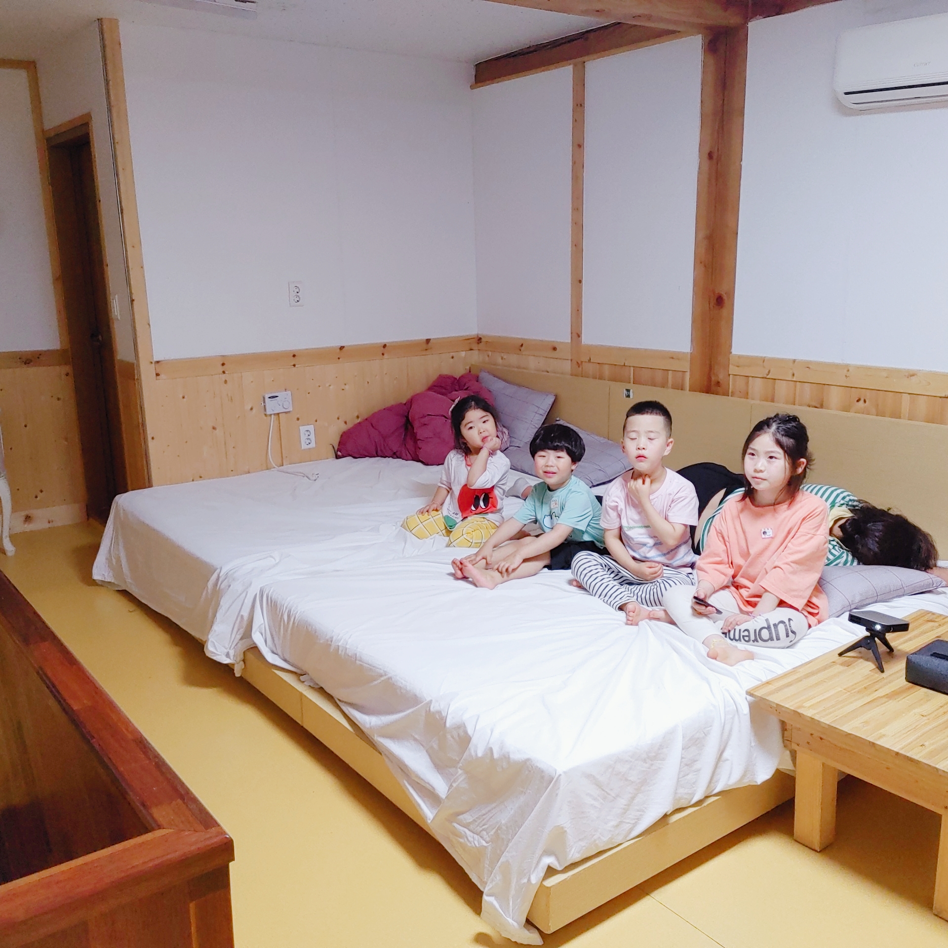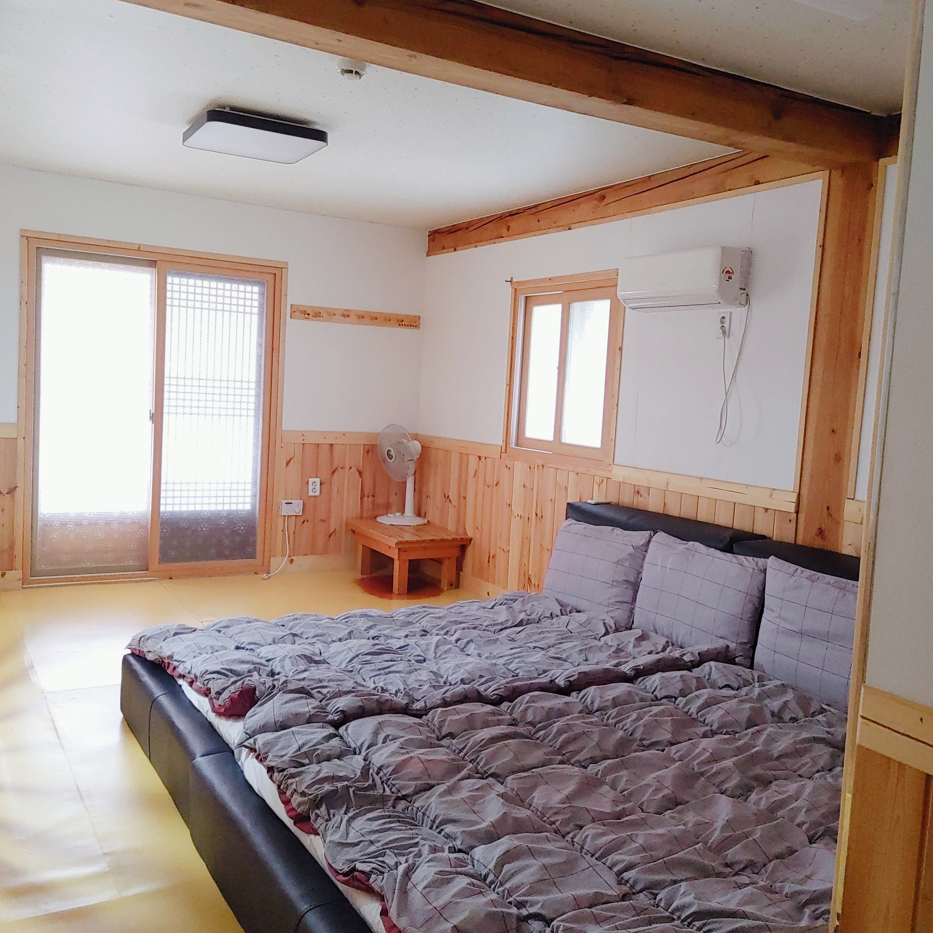 패밀리침대와 에어컨, 선풍기가 있답니다. 에어컨도 시원하게 작동이 잘되더라고요.
