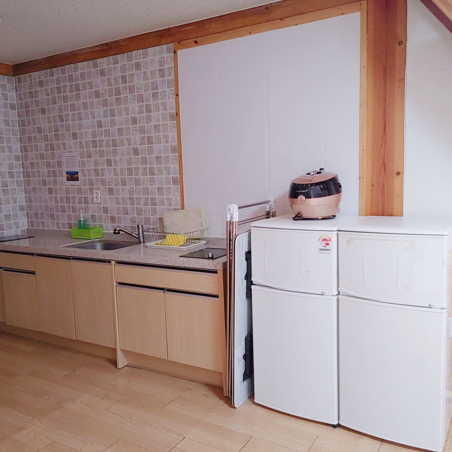 고운재 4번 방의 냉장고는 가정용 냉장고 같은 게 들어가 있어요. 냉장고 크기가 훨씬 크답니다. 그리고 올라가는 계단도 훨씬 안정적으로 되어있고, 올라가는 폭도 넓답니다.