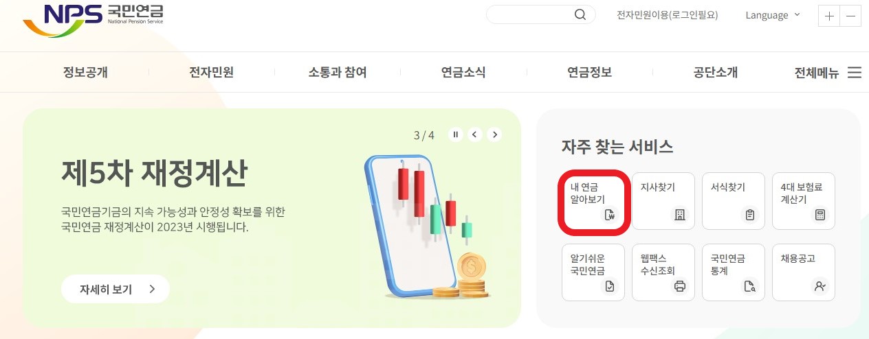 NPS 국민연금 홈페이지에 접속하면 첫 화면에 자주 찾는 서비스 > 내 연금 알아보기를 눌러주세요.