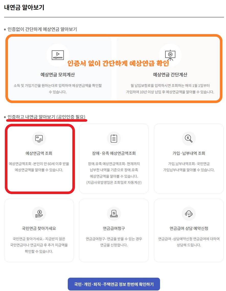 본인인증이 힘드시다면 본인인증 없이 "예상연금 모의계산","예상연금 간단 계산"으로 소득 및 가입기간을 원하는 대로 입렵하여 예상연금액을 간단하고 쉽게 알아볼 수도 있습니다.