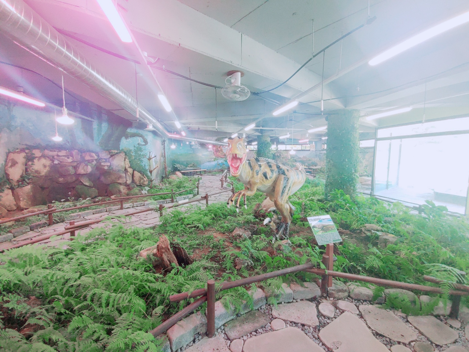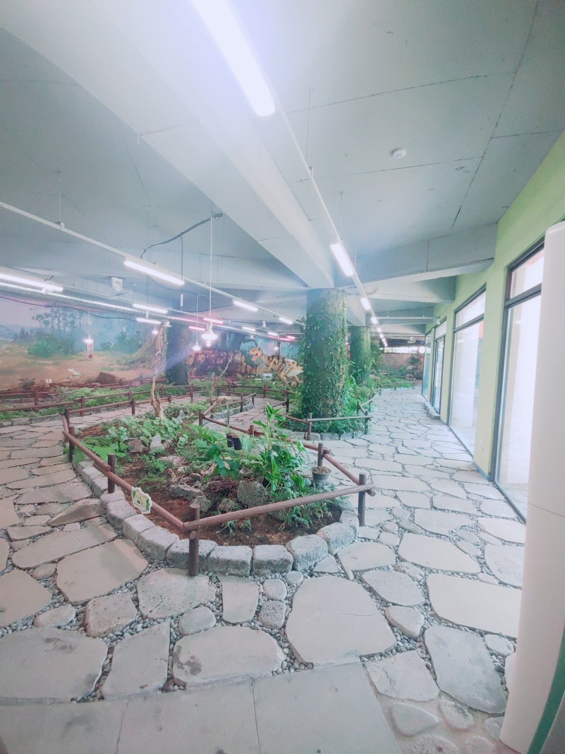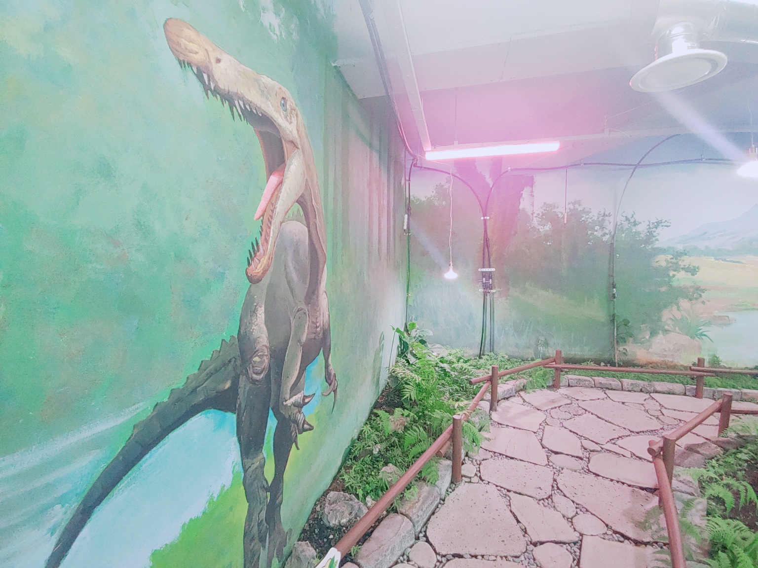 입구 오른쪽은 이끼정원 이랍니다. 이끼와 습지식물이 있고, 공룡 모형과 벽에도 공룡그림이 그려져 있어요.