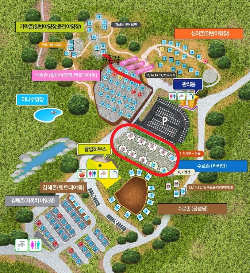 이번에 캠핑한 수로존!! 위치는 클럽하우스(매점)와 주차장 사이에 있답니다.