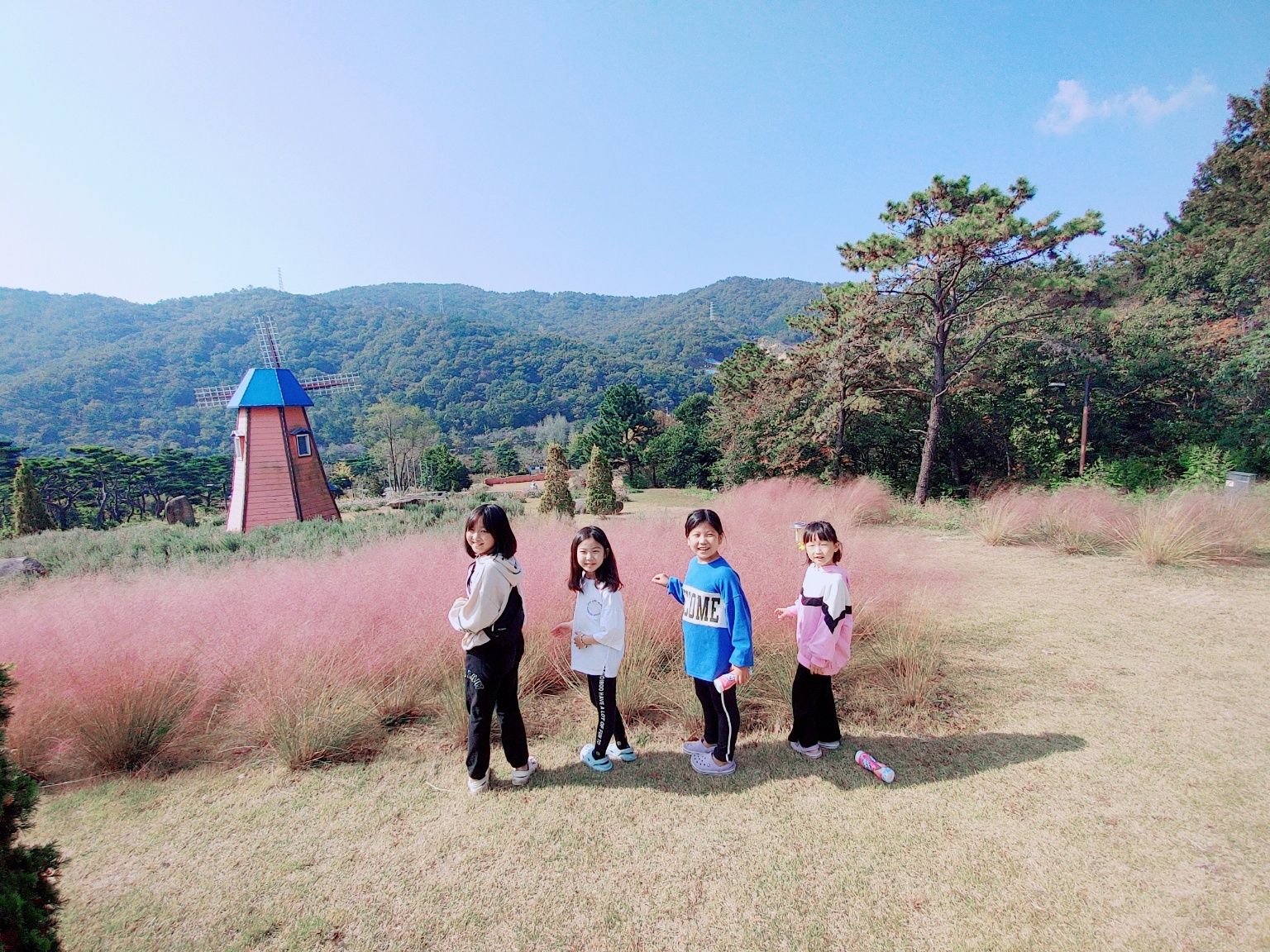 가야랜드 가는 길에 풍차가 있어요!! 우리 집은 올해 처음 보는 핑크뮬리가 딱하니 피어있더라고요.