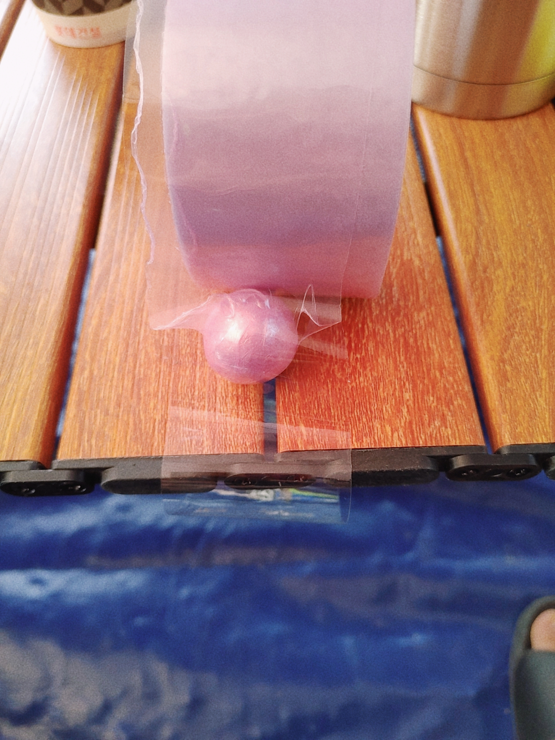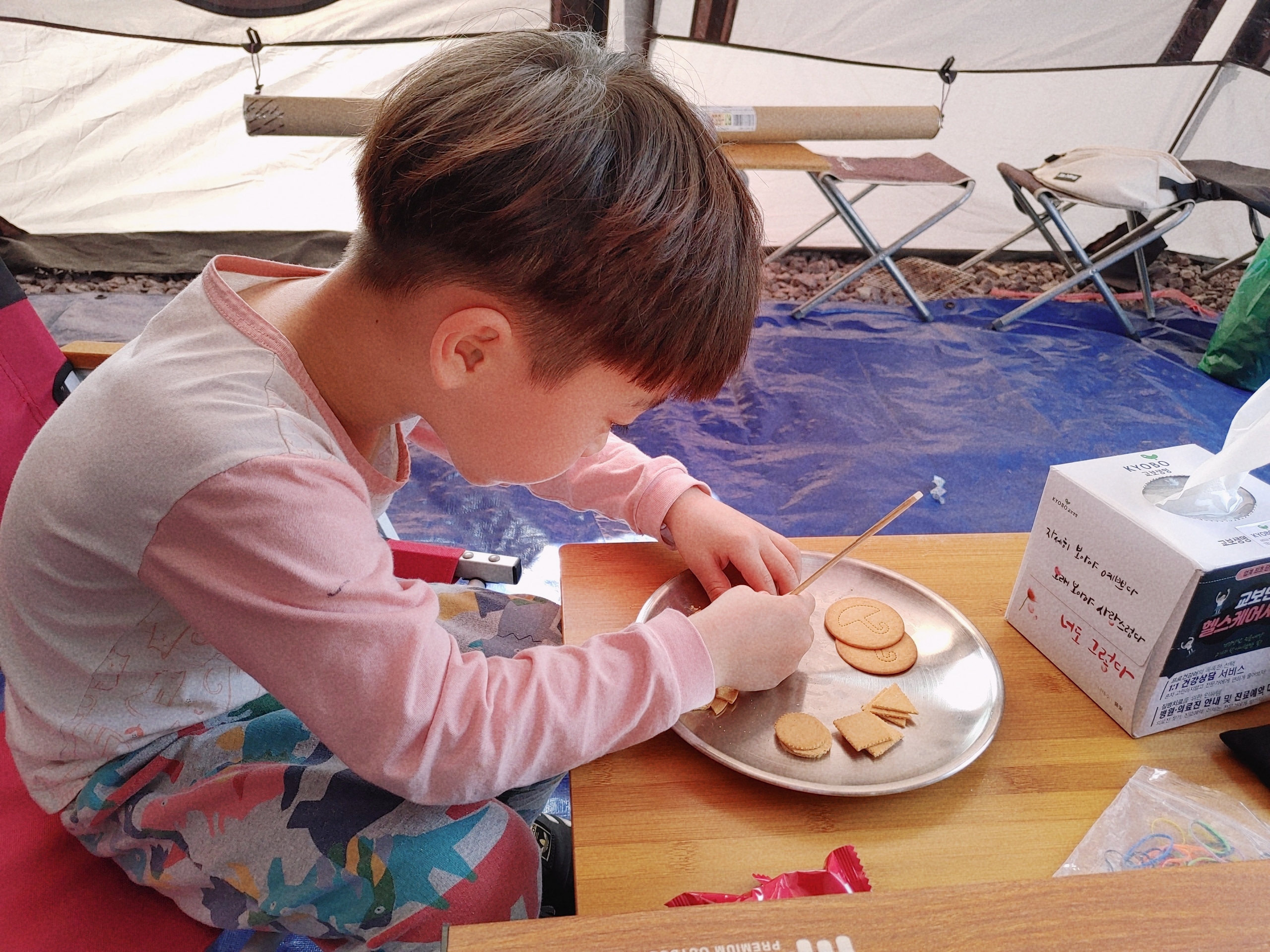 둘째 날 아침에는 달고나대신 달고나과자로 열심히 달고나게임을 하는 아들이랍니다. ^^ 달고나 게임도 하고, 요즘 유행한다는 테이프공도 만들어보았답니다.^^