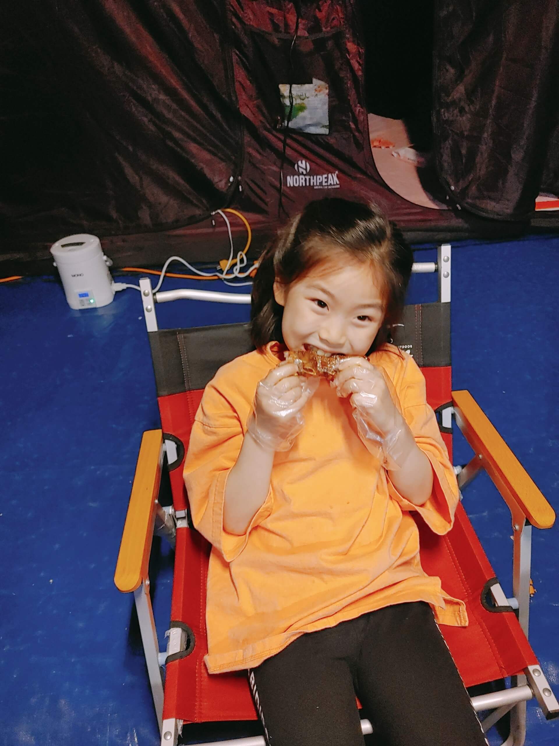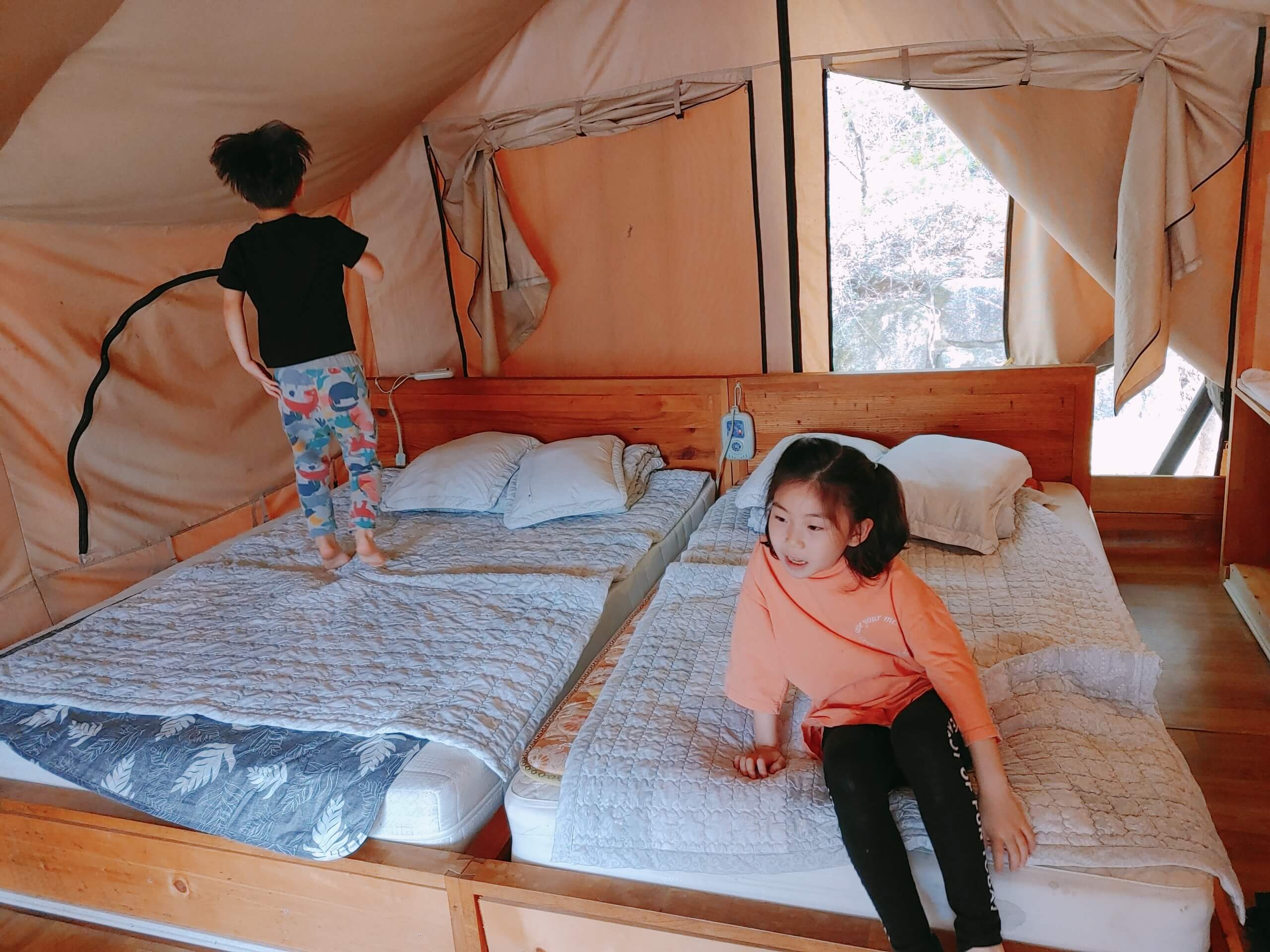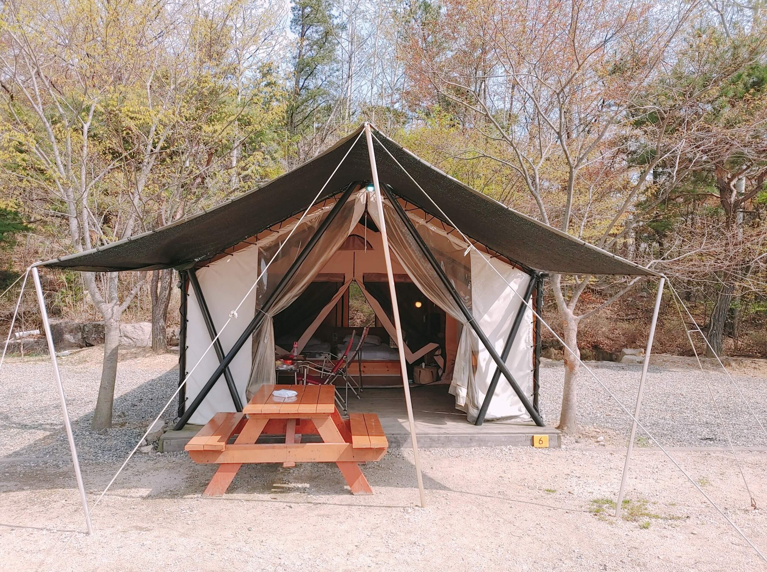 텐트밖에 나무테이블이 있고, 안에는 캠핑테이블과 릴랙스 의자가 있었어요. 그리고 입장할 때 조리도구도 챙겨주시더라고요. 냉장고와 전자레인지, 가스버너가 비치되어 있답니다. 4월까지는 선풍기가 없고, 온풍기가 있었어요. 저희 가간 주말에 낮은 한여름이어서 너무 더웠어요..;; 그리고 일행이 저녁에 추워서 온풍기를 틀었는데 기름냄새가 많이 나서 끄고 이불을 꼭덥고잤다고 하더라고요.