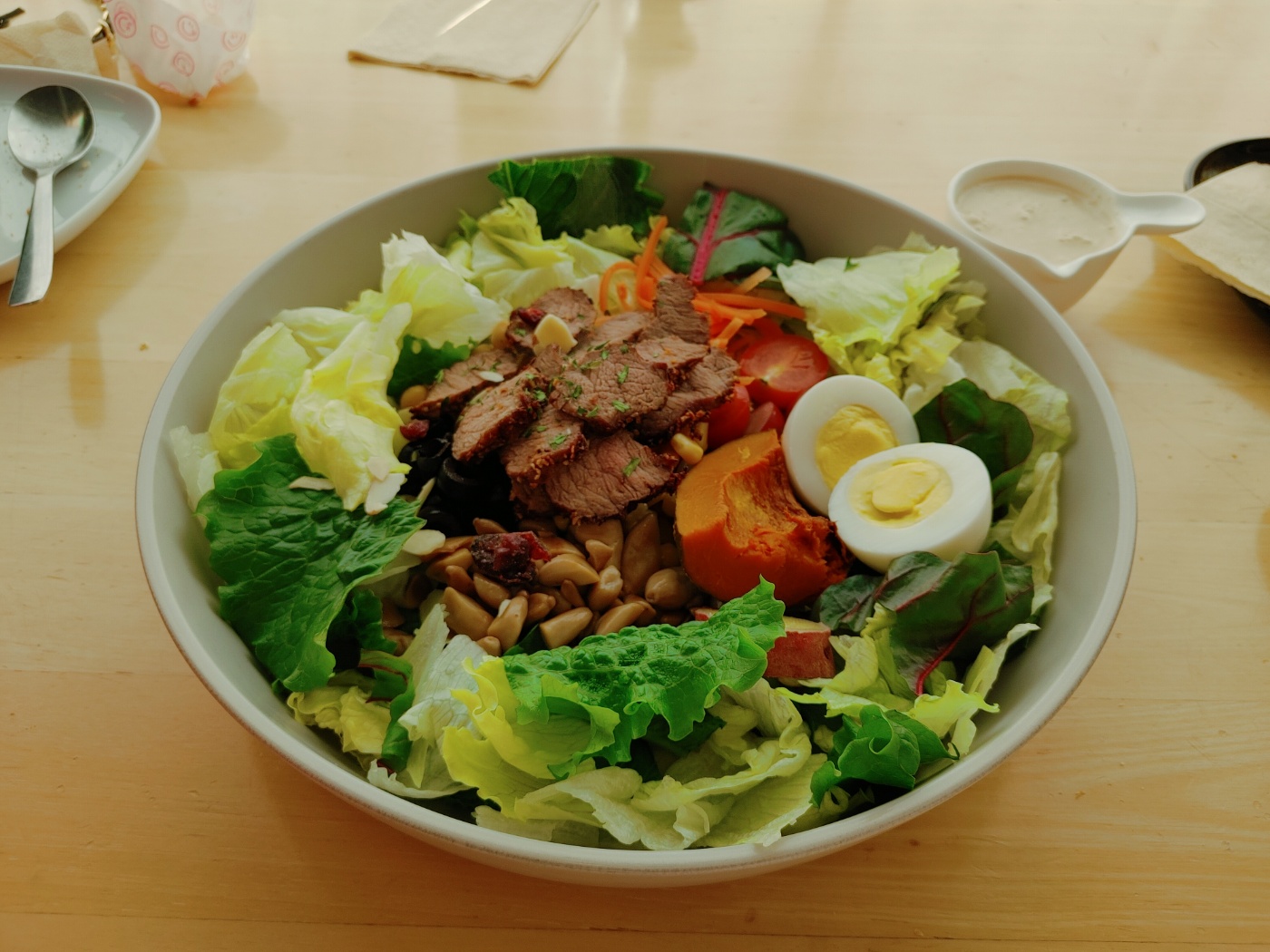 소고기스테이크와 구운 버섯, 삶은 달걀, 단호박이 곁들여진 샐러드예요. 드레싱은 참깨크림이에요.