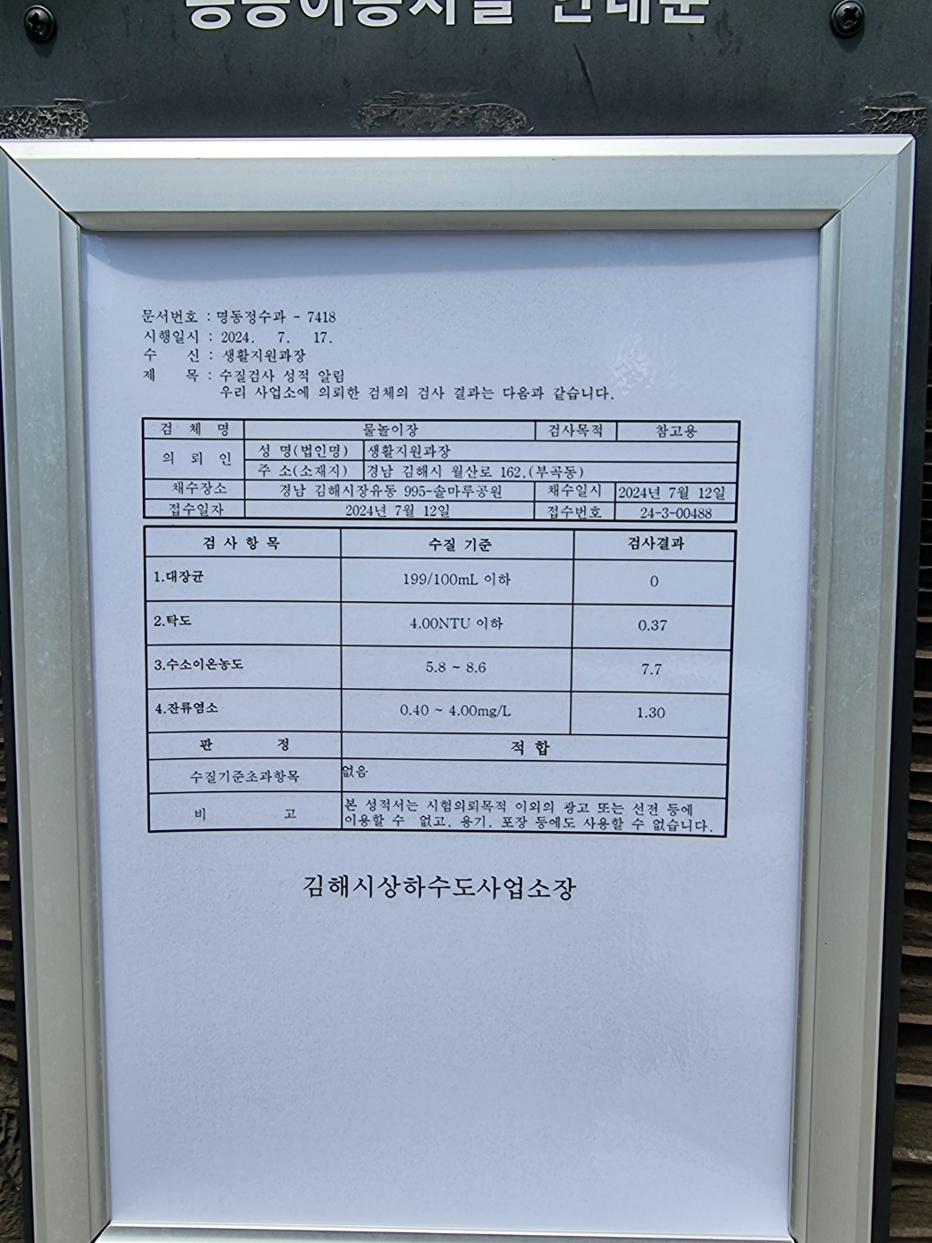 물놀이 놀이터에는 수질검사표가 딱~~ 붙어 있답니다.
