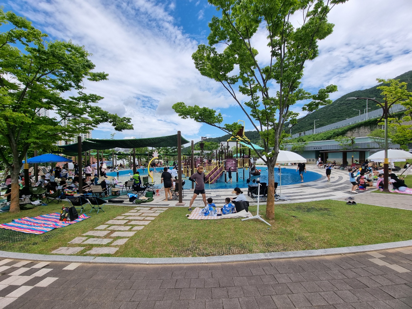 솔마루공원 물놀이터에는 그늘막자리가 있는데, 저곳은 부지런한 사람들 자리!!