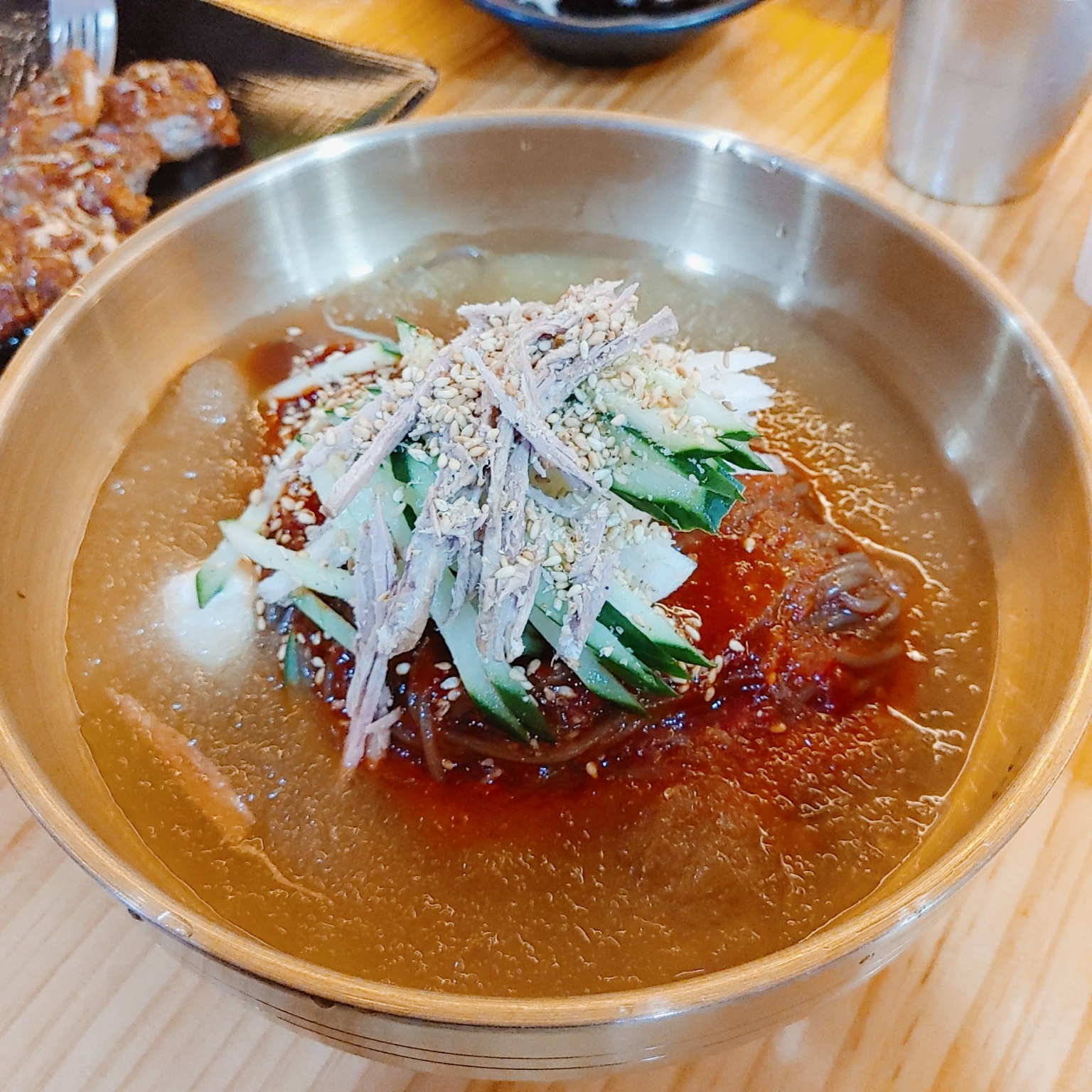 시원한 육수 메밀면이 잘 어울리더라고요. 냉면보다는 면이 부드러워서 먹기가 편했답니다.