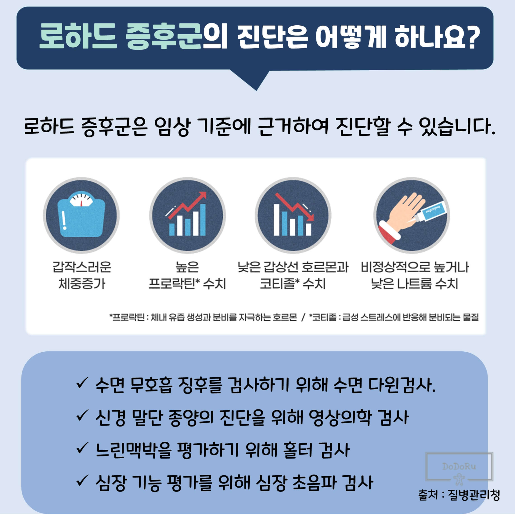 로하드 증후군으로 의심되거나 진단된 환자에서는 폐쇄성 수면무호흡 혹은 중추성/폐포성 저환기에 대한 평가를 위해 수면다원검사가 필요하며, 신경 말달 종양의 진단을 위해 흉부 및 복부 영상의학 검사, 심장 기능 평가를 위해 심장 초음파 검사가 필요합니다. 또한 뇌하수체 기능저하에 대한 내분비적 호르몬 평가와 함께 비만으로 인한 합병증에 대한 확인이 필요합니다.