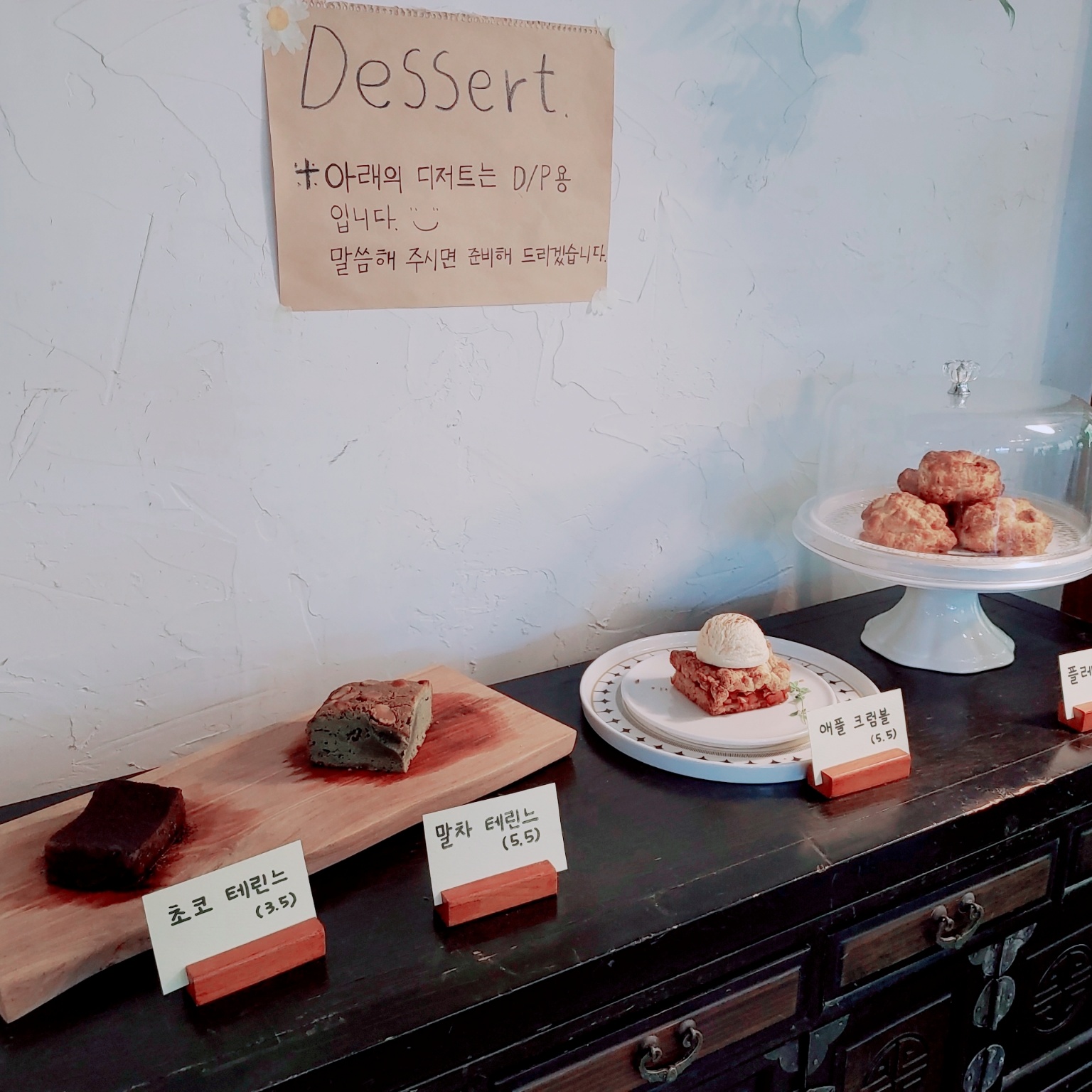 디저트는 뒤쪽에 DP 되어있는 게 다랍니다. 그때그때 조금씩 달라지는듯해요. 예전에 크로플이 있었던 거 같은데 이제는 안 한다고 하시더라고요.