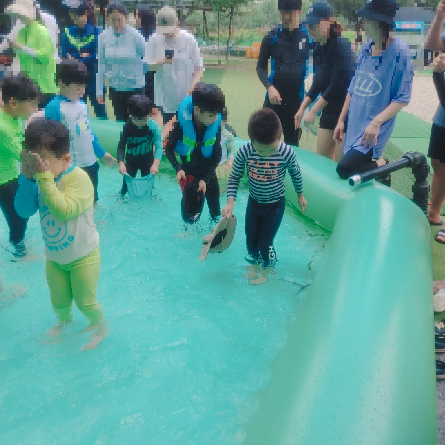 키즈풀장과 어린이풀장에서 오후 2시에 무료로 체험이 가능해답니다. 키즈풀장은 유치원생들까지만 은어 잡기를 할 수 있고, 초등학생부터는 어린이풀장에서 은어잡기 체험을 한다고 합니다. 저희는 키즈풀장과 어린이풀장으로 찢어져서 은어잡기를 했어요. 키즈풀장에는 아이들이 못 잡으면 나중에 부모님들이 도와줄 수 있답니다. 그런데 아빠님들 아이들이 잡으려고 하는데도 에누리 없이 먼저 확 잡아가버리더라고요;;;; 부모님들이 잡게 해 주면 그래도 즐기는 아니 들도 있으니 어느 정도 자제를 해주면 참 좋았을 텐데....
