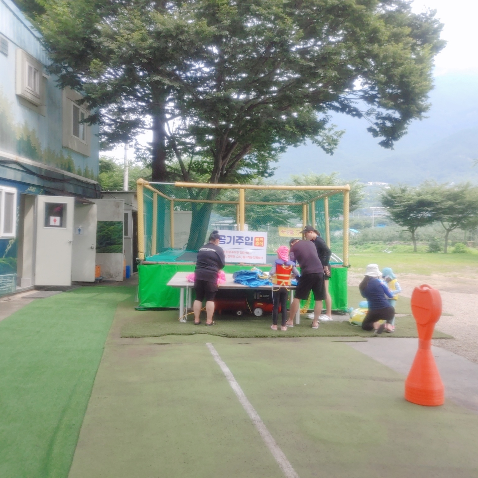 화장실 옆쪽에 방방이가 있어요. 방방이 앞쪽으로 튜브바람을 넣는 에어프레셔가 있답니다. 폭포 관광농원은 튜브 바람 넣는 거는 무료랍니다.