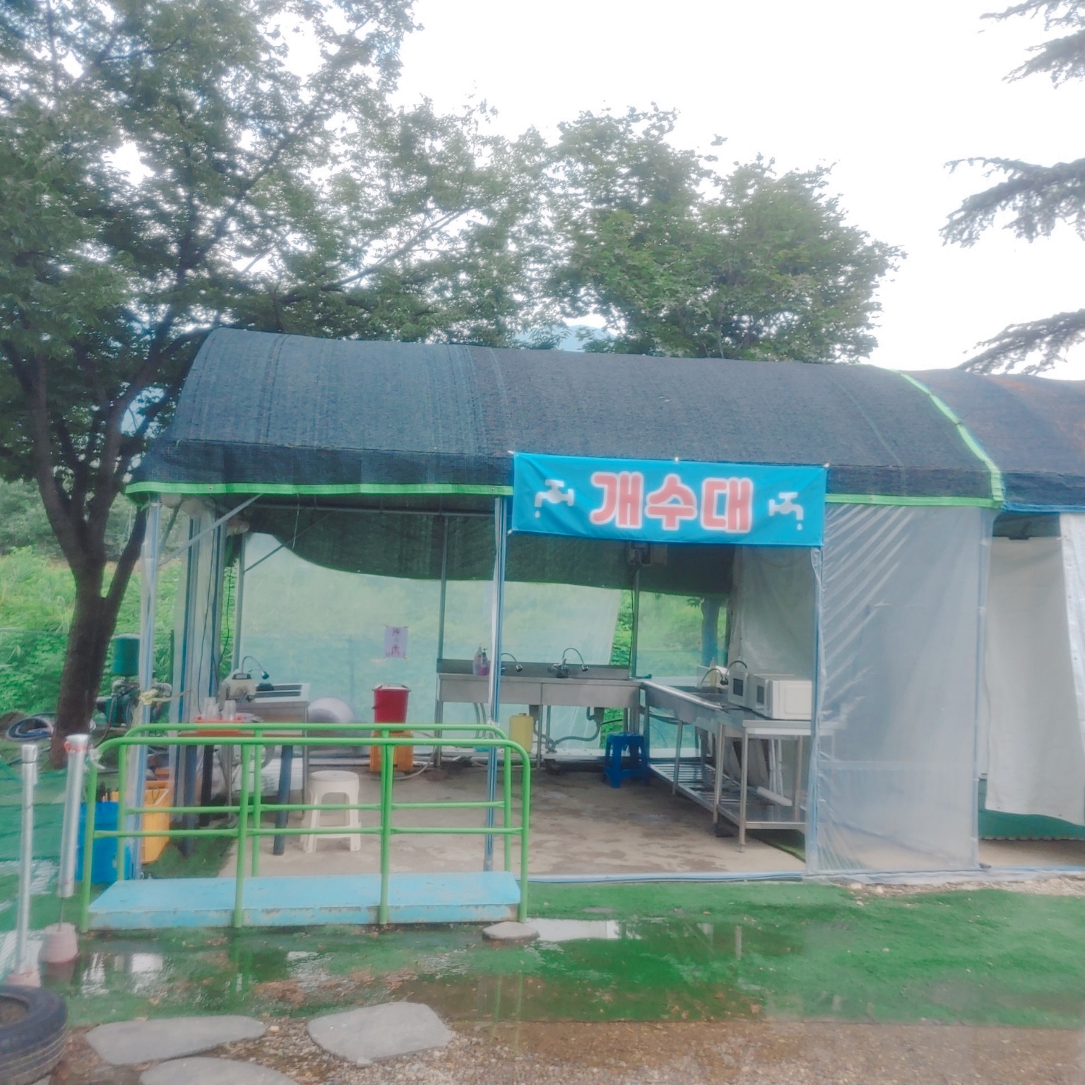 개수대가 있어서 설거지가 가능해요. 주방세제는 구비되어 있지만 수세미는 안보이더라고요. 개인적으로 챙겨 오셔야 할 것 같아요. 그리고 전자레인지도 있으니 햇반이나 전자레인지 사용하는 음식도 챙겨 오셔도 된답니다.