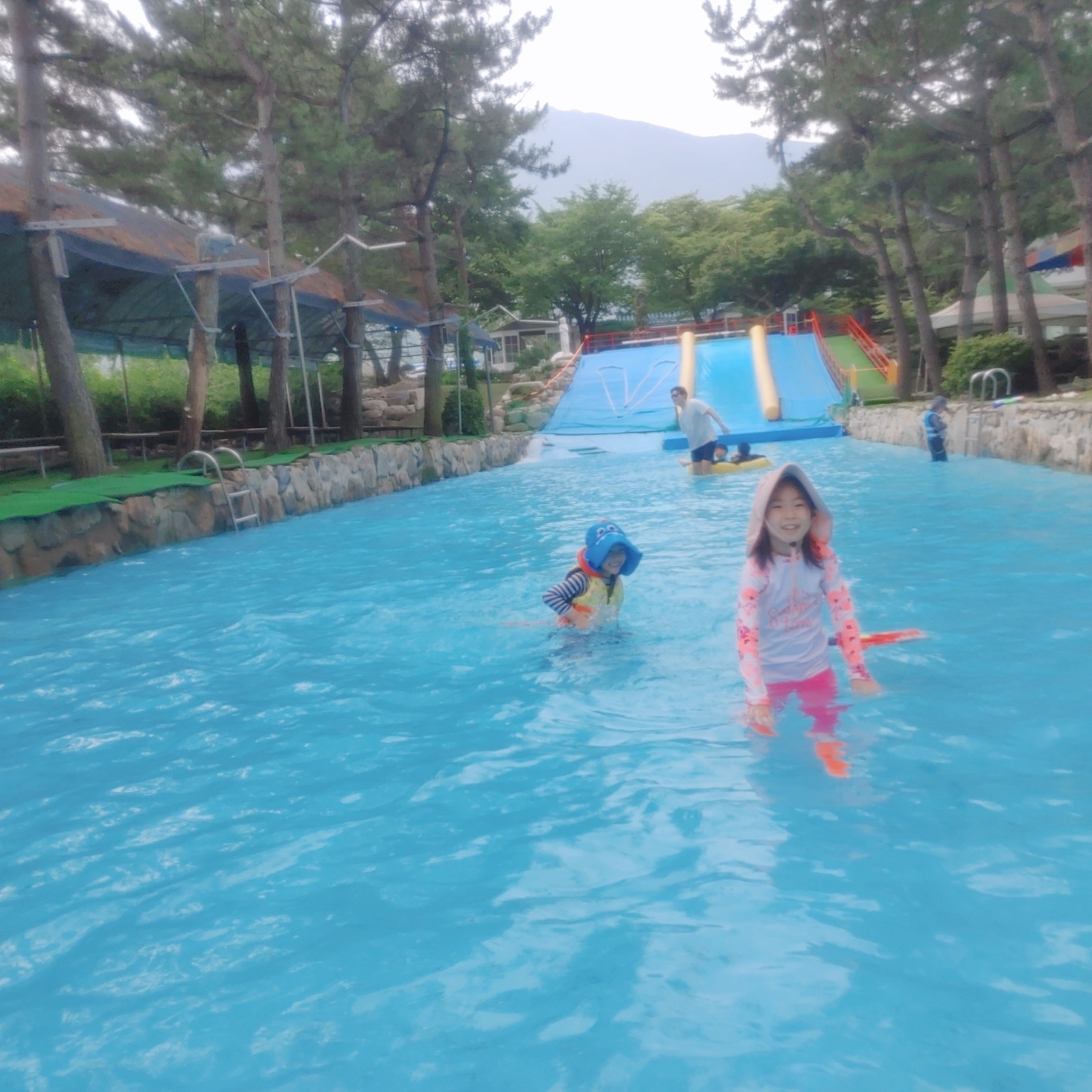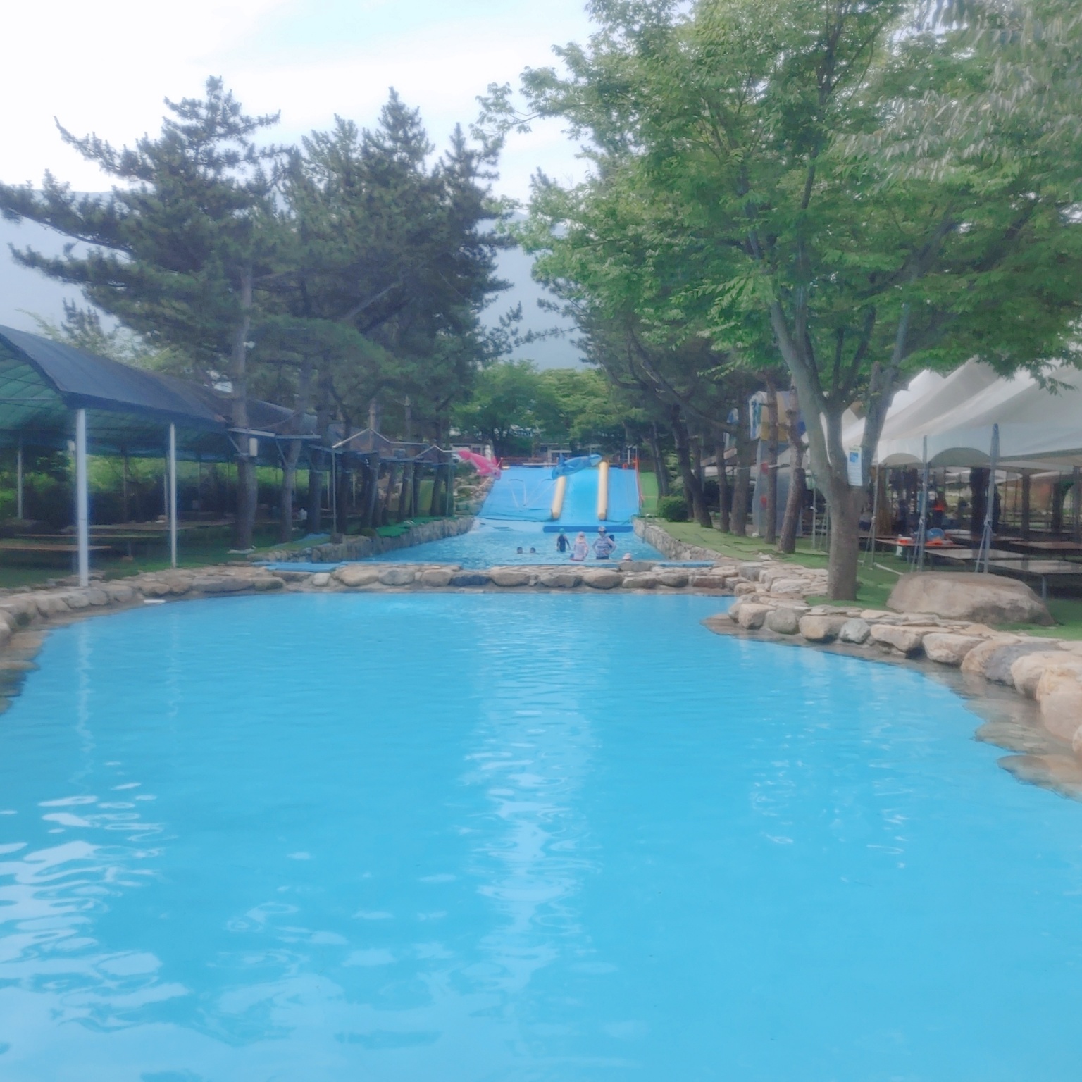 아침에는 물이 깊지 않은데, 오후정도 되니깐 물이 점점 깊어지더라고요. 워터슬라이드 있는 쪽으로 갈수록 물이 낮아진답니다. 워터슬라이드는 11시쯤부터 운영했던 거 같아요. 물이 어느 정도 받아지면 시작하는 것 같아요. 워터슬라이드를 탈 때는 튜브가 필수로 있어야 한답니다.
