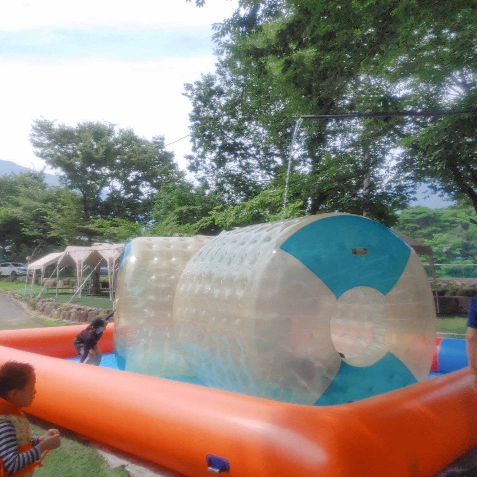 에어풀장에는 원형 풍선 안에 들어가서 탈 수 있는 튜브도 있었어요. 안에서 굴리면 앞으로 간답니다. 공간이 조금 좁아서 재미가 있을까 했는데, 엄청 좋아하더라고요. 그런데 안이 올록볼록하다 보니 깨끗하지는 않았어요. 얼굴이랑 옷에 검은 찌꺼기들이 묻어 나오더라고요. 뭐 그래도 신나게 놀았으니 됐어 ~~~