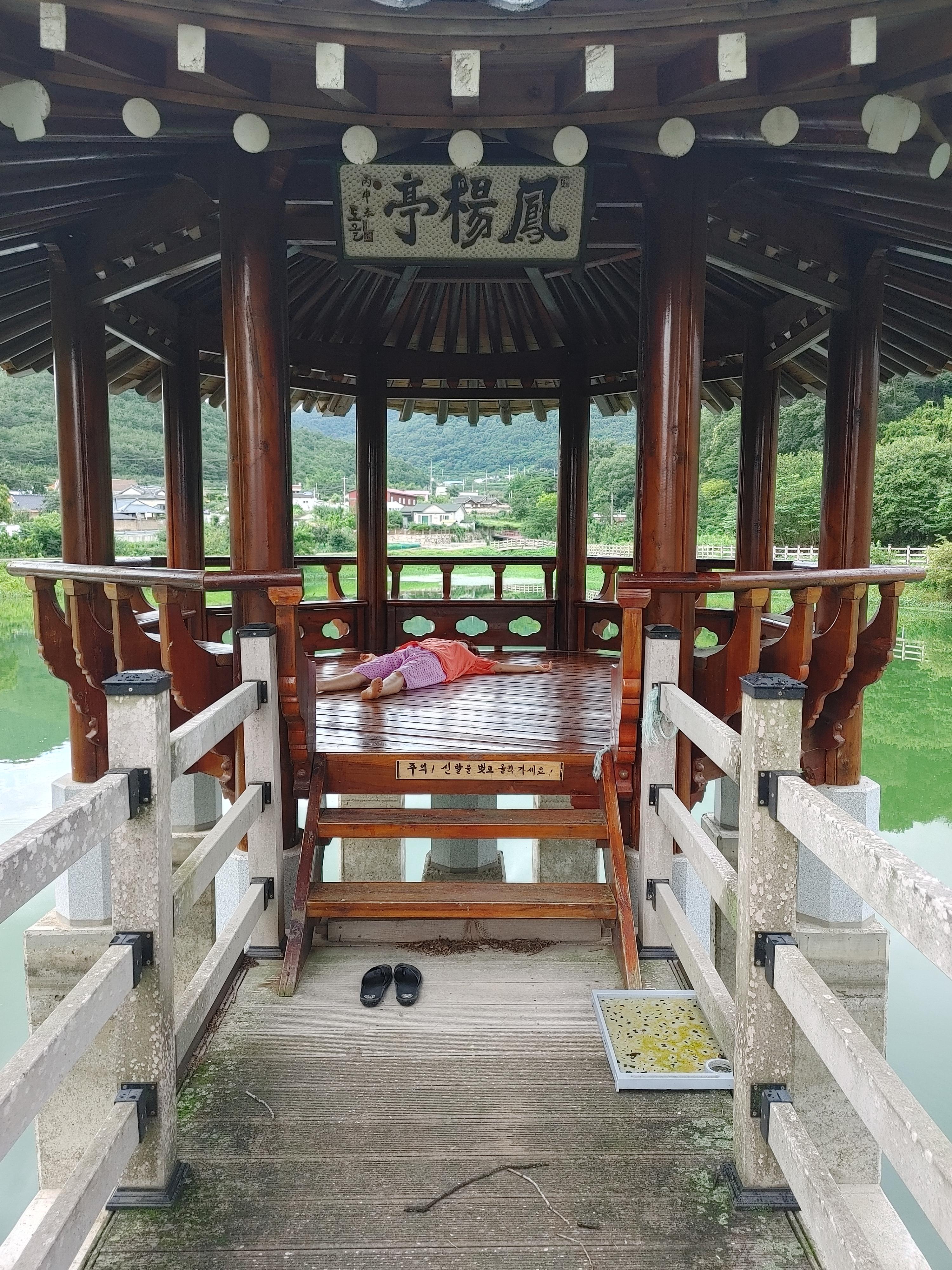 보호수 따라 옆으로 가니 호수 위에 정자 하나가 있더라고요~