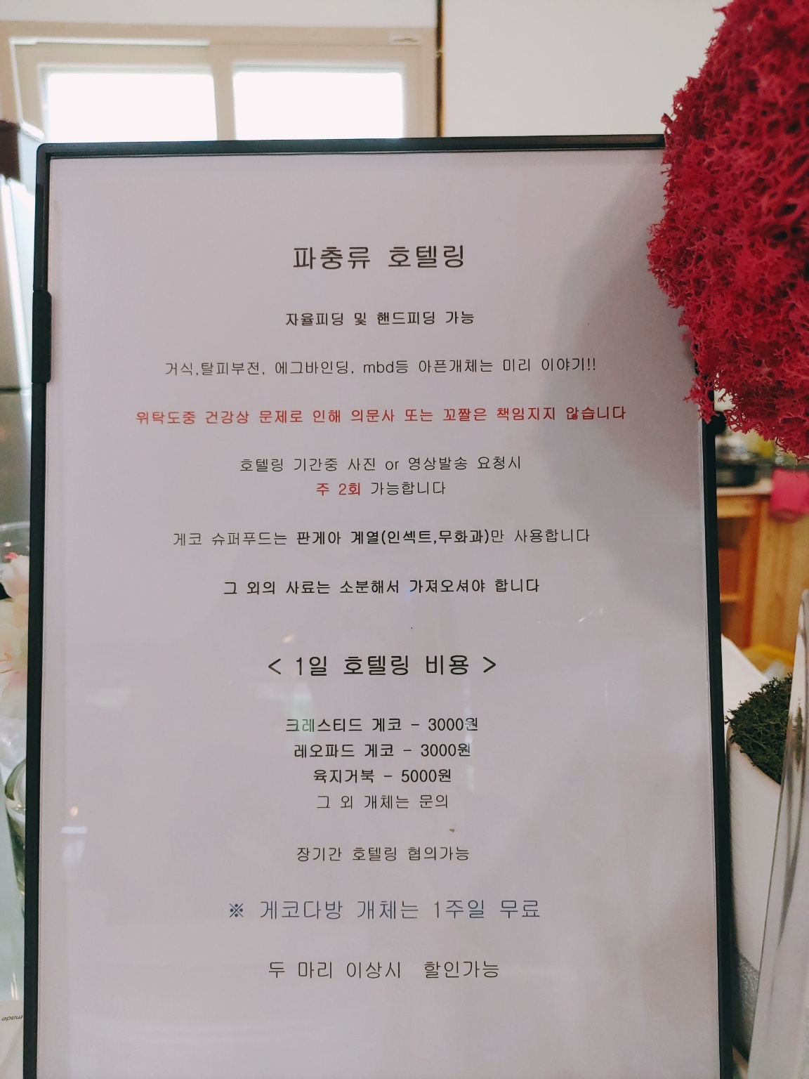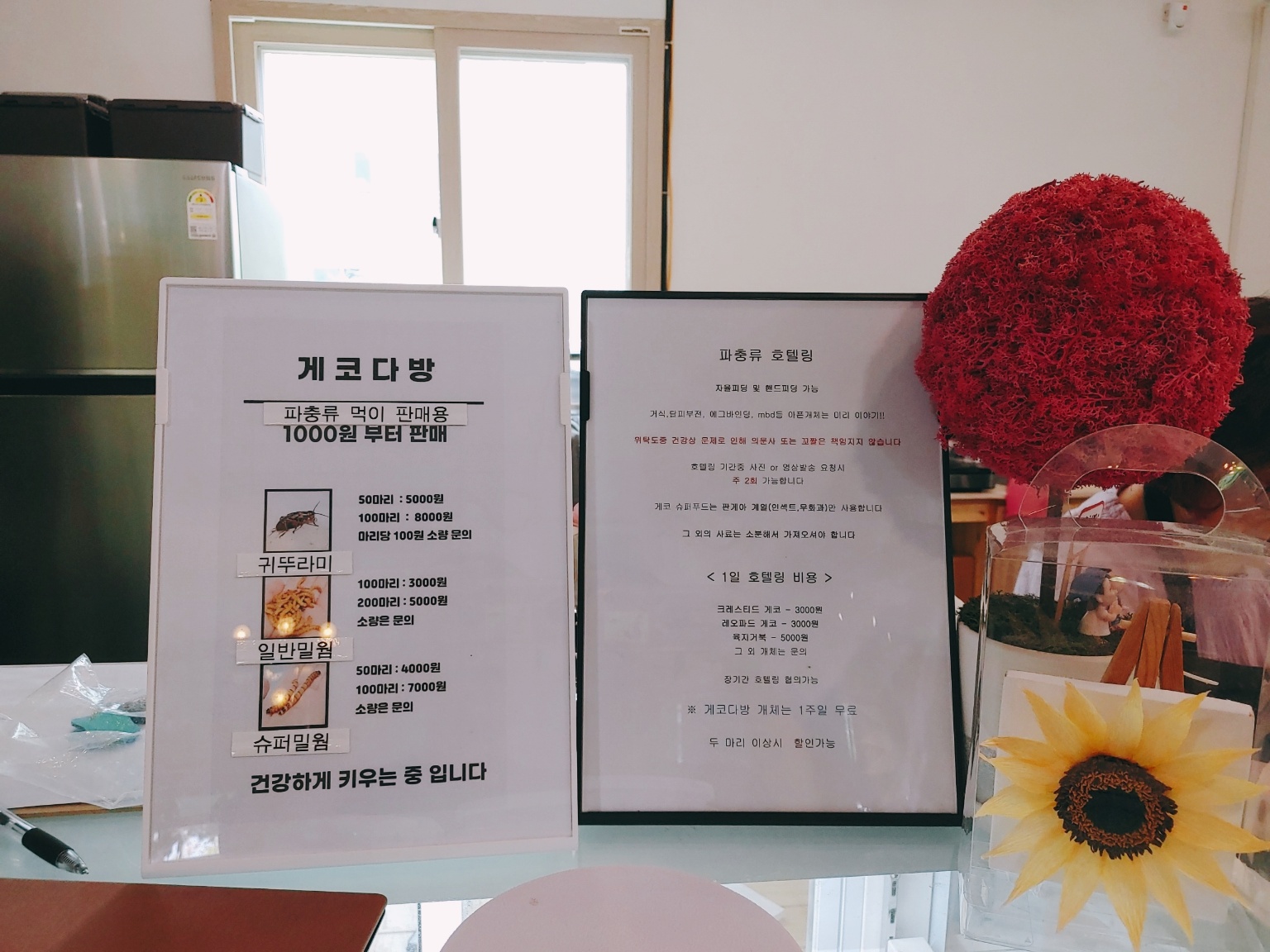 게코다방에서는 체험뿐만 아니라 도마뱀을 판매도 하고, 호텔링 서비스도 같이 하고 있답니다. 그리고 먹이도 함께 판매하고 있어요.