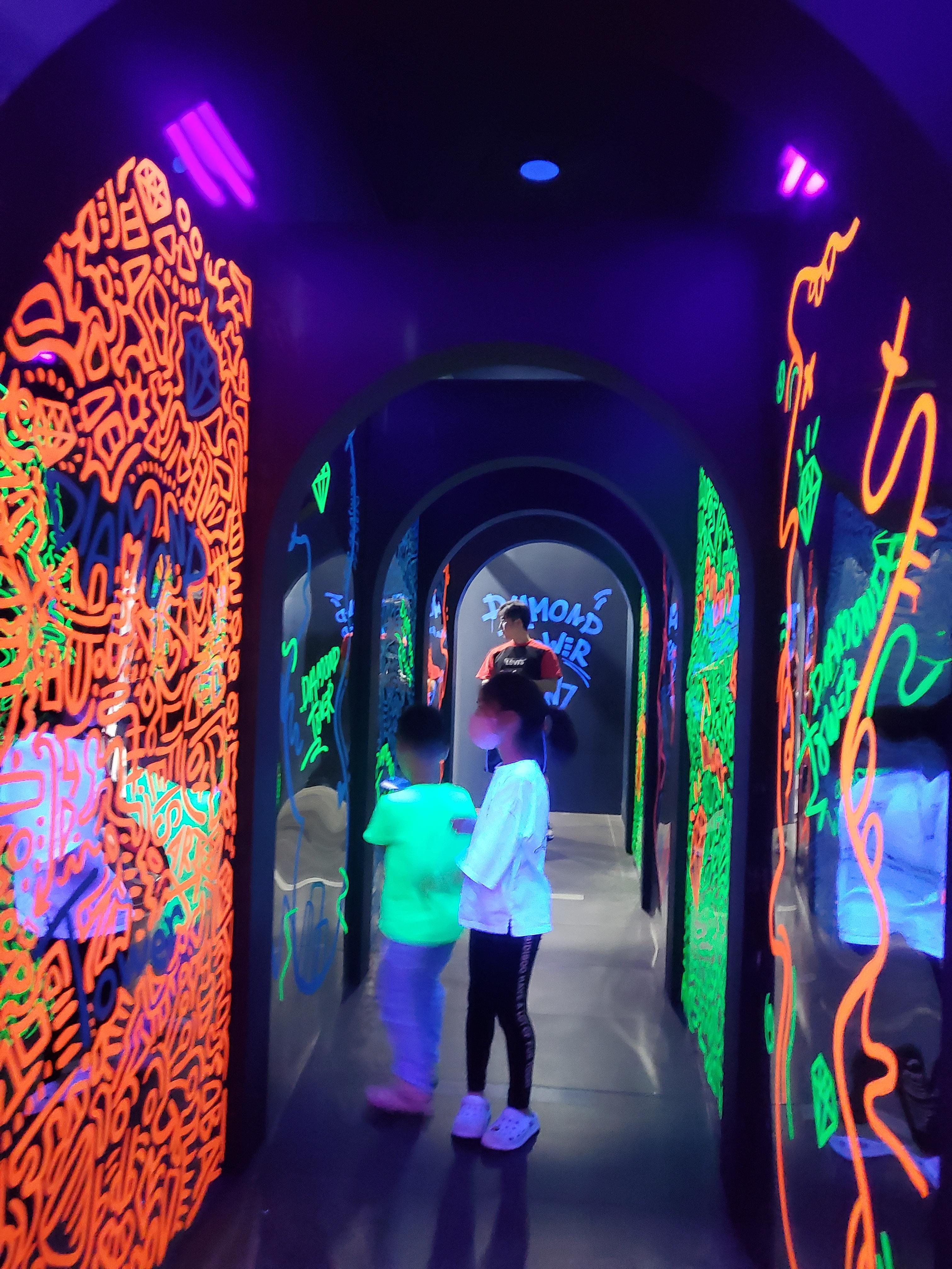 부산 다이아몬드 타워는 층별로 다양한 테마로 꾸며져 있답니다. 첫 번째로는 이모션 워크예요. UV조명을 이용해서 야광처럼 보이더라고요. 흰옷과 밝은 연두색옷을 입은 저희 아이들은 엄청 신나 해 하더라고요. ㅎㅎ