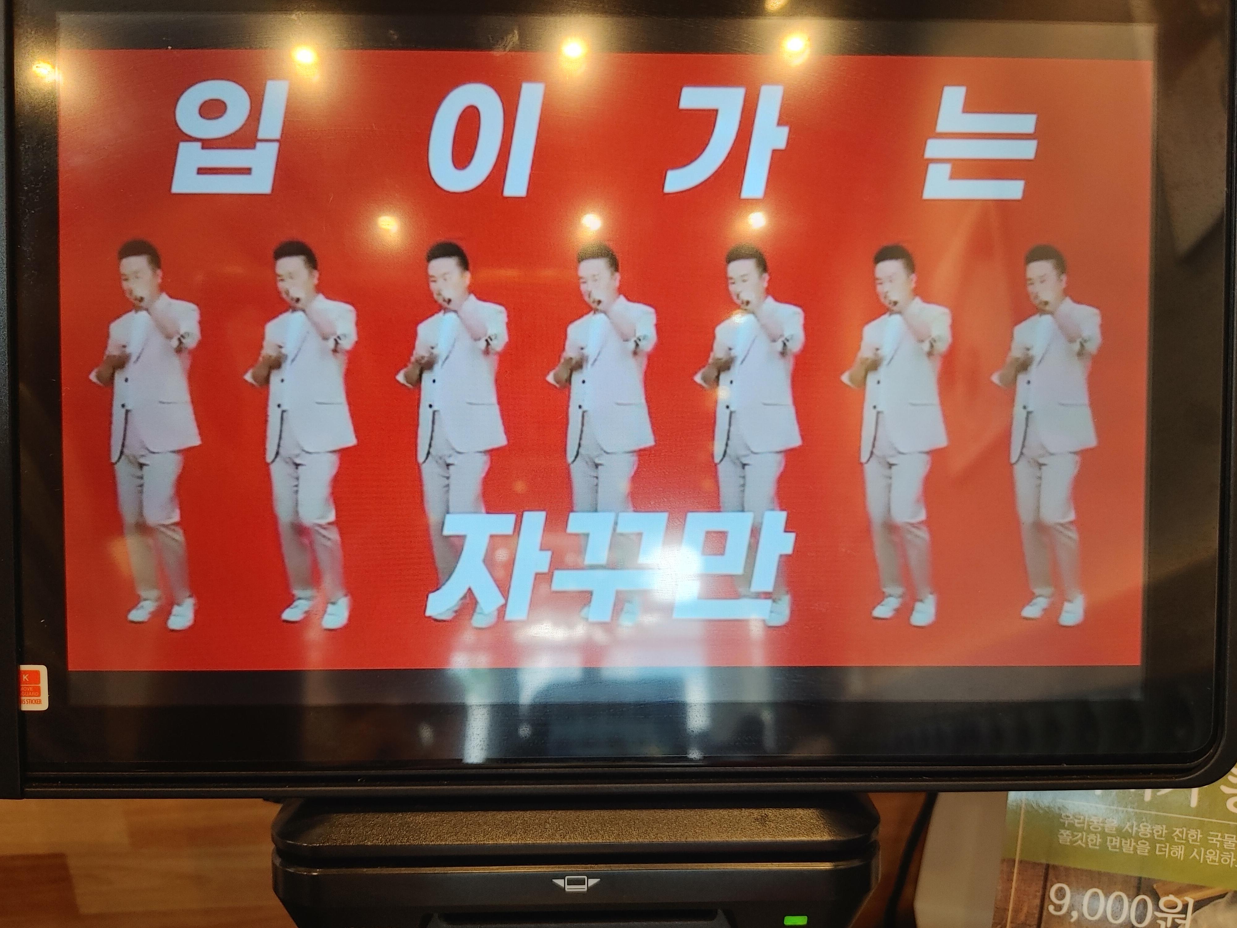 이렇게 테이블마다 주문할 수 있는 태블릿이 있어요. 그리고 바로 결제할 수 있게 단말기도 같이 있답니다.