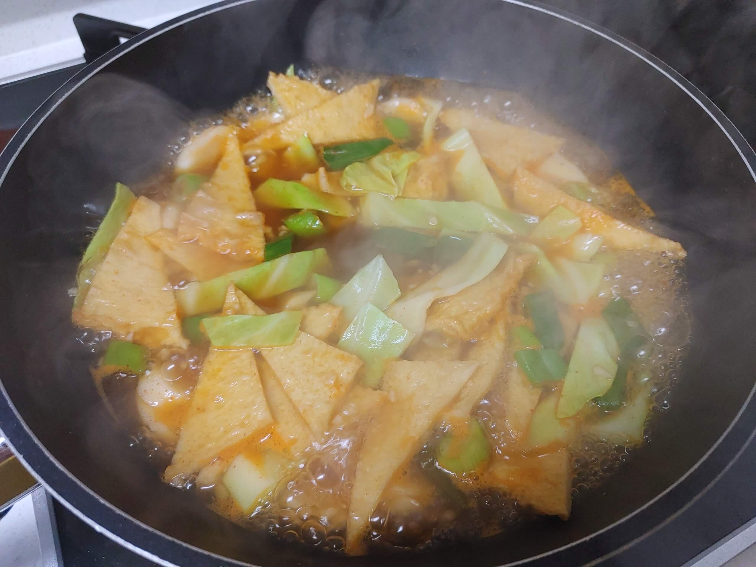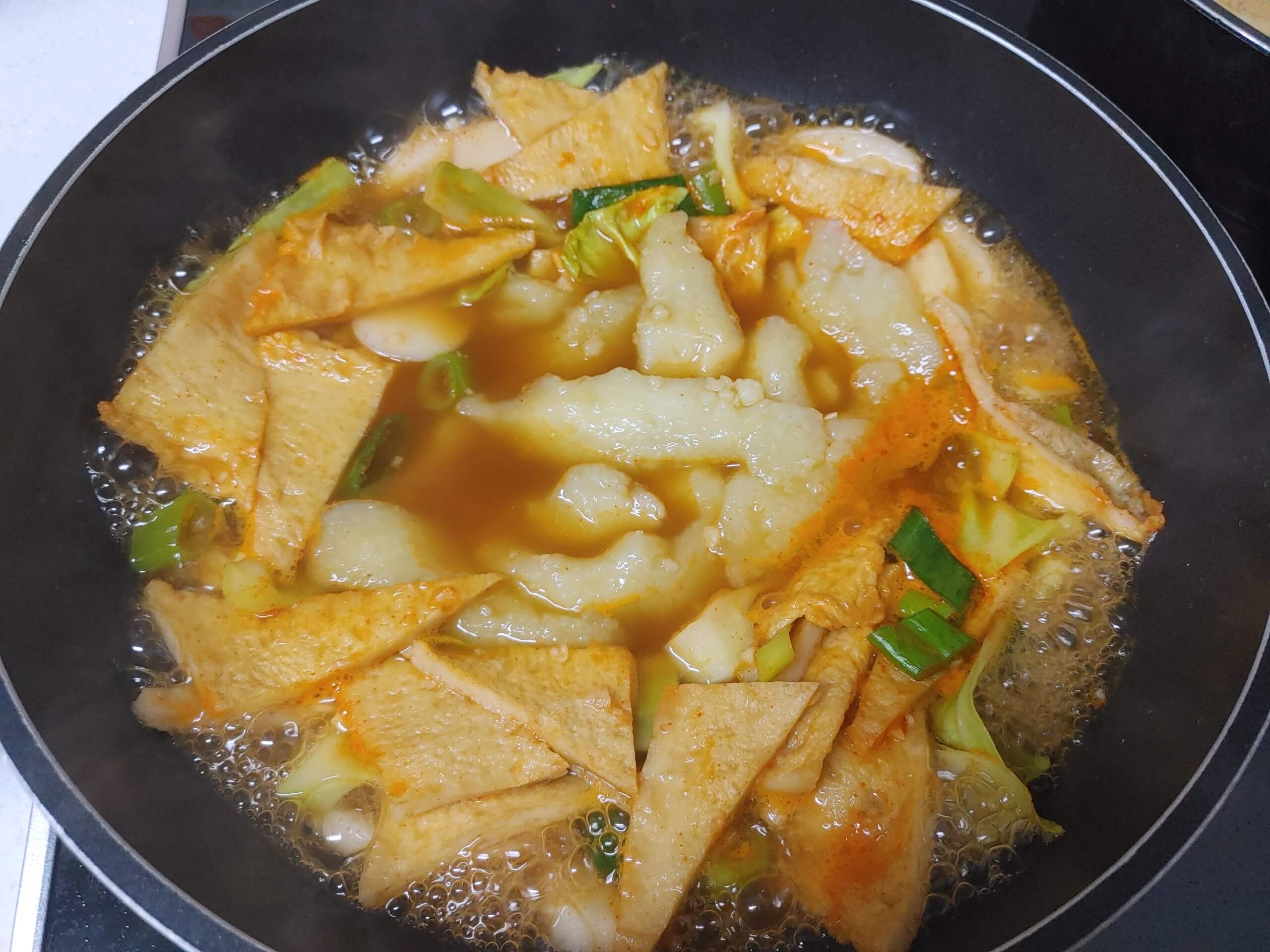 6. 어묵, 야채, 떡 → (감자) → 대파 순서로 넣어주세요. 저는 아이들이 배고픈 다해서 한 번에 다 넣고 끓여버렸네요;;;