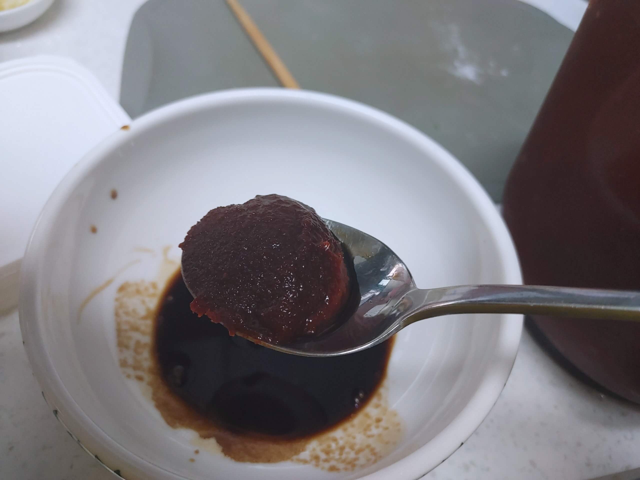 5. 육수 2 국자에 떡볶이 양념장을 조금씩 풀어서 우리 아이가 먹을 수 있는 양정도를 맞춰줍니다. 저희 집은 생각보다 고추장이 너무 매워서 양념을 반도 사용 못했답니다. 그래서 간장과 설장을 조금 더 넣어서 간을 맞춰주었어요.