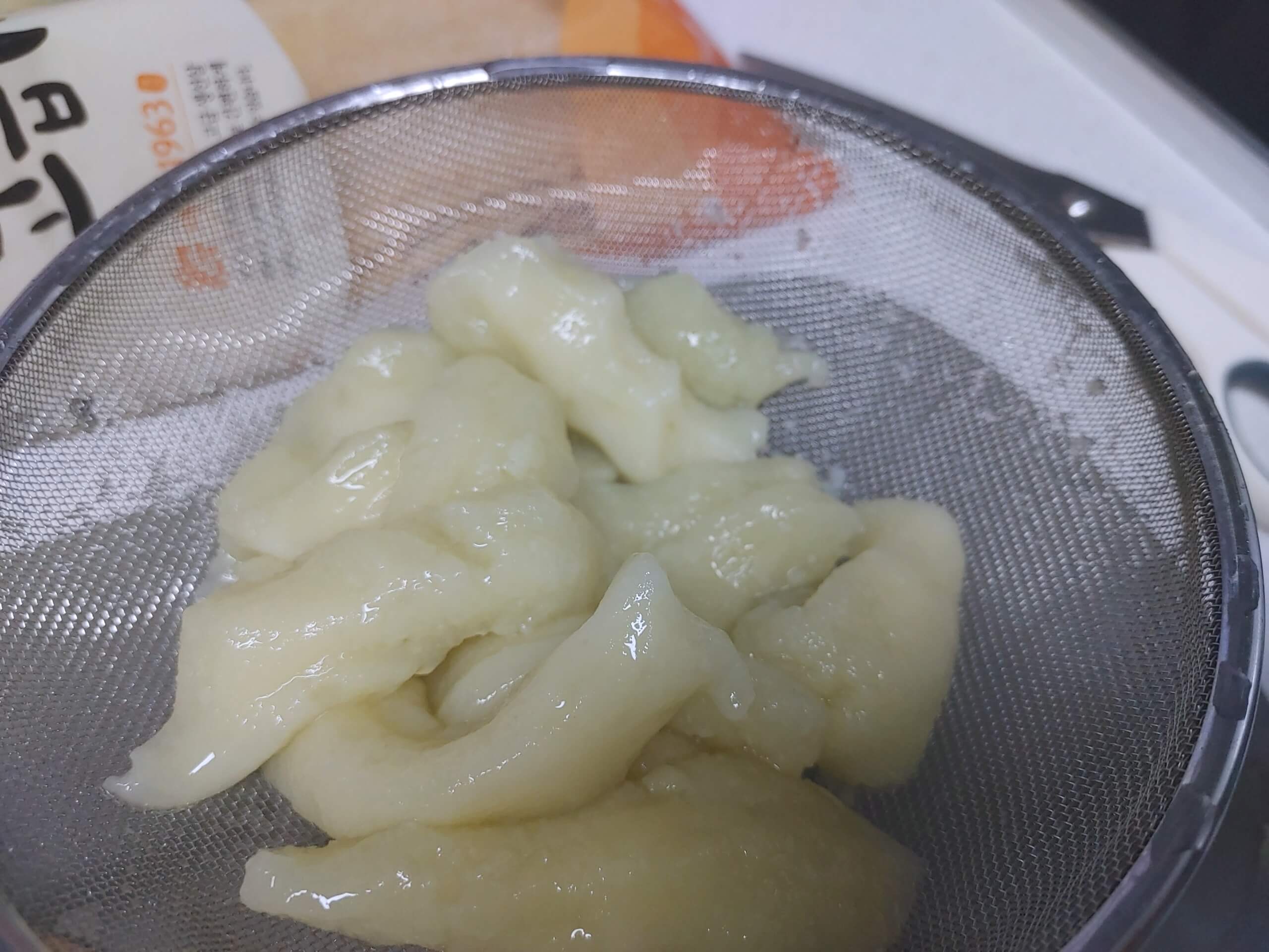 감자 1개 + 소금 1/4T + 찹쌀가루 2T + 물살짝 → 반죽하기 → 뜨거운 물에 데치기 → 익으면 찬물에 담가서 헹궈주기