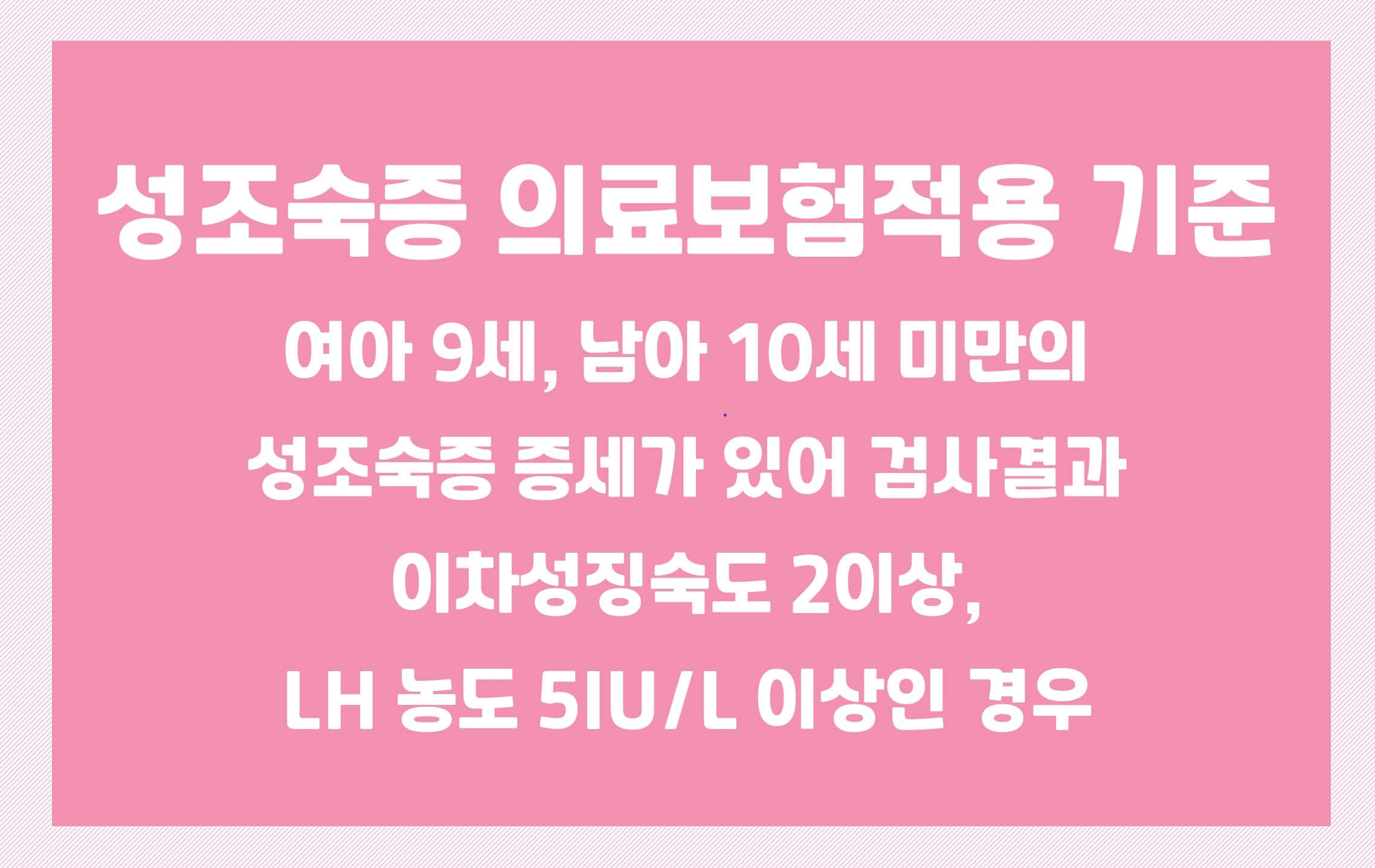 현재 성조숙증 치료 주사제 건강보험 적용 기준은 이차성징성숙도(Tanner stage)가 2 이상이면서 골연령이 역연령 보다 증가되고 자극검사에서 황체형성호르몬(LH)이 기저치의 2-3배 증가되면서 최고 농도는 5IU/L이상인 경우에 보험적용 대상입니다.