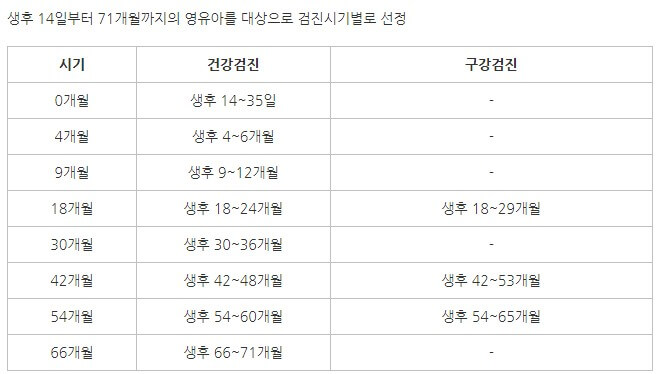 영유아검진은 해당 검진시기에 1회에 한하여 받을 수 있습니다.