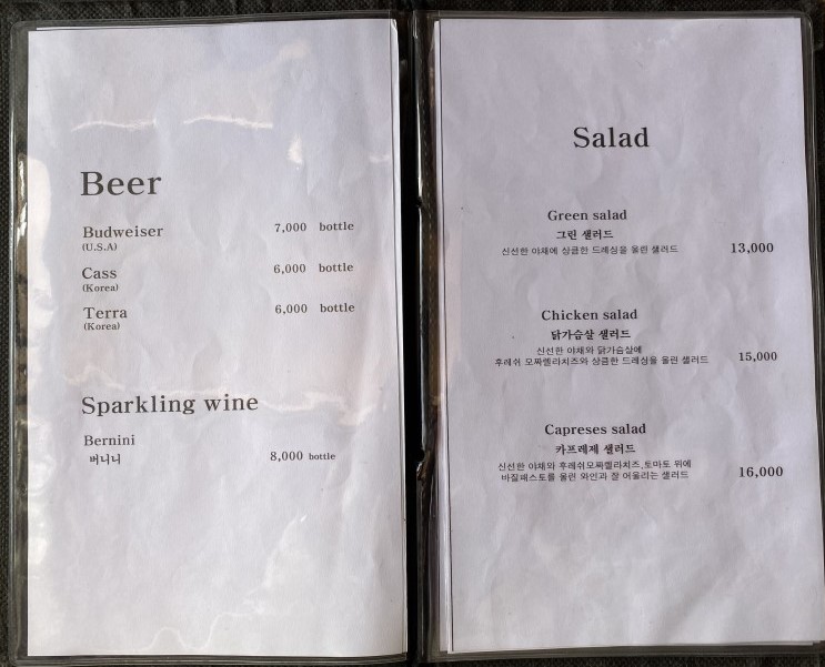 메뉴는 피자, 파스타, 샐러드와 음료가 있답니다. 메뉴가 많은 편은 아니에요. 나름 관광지라 그런지 가격대가 있더라고요.