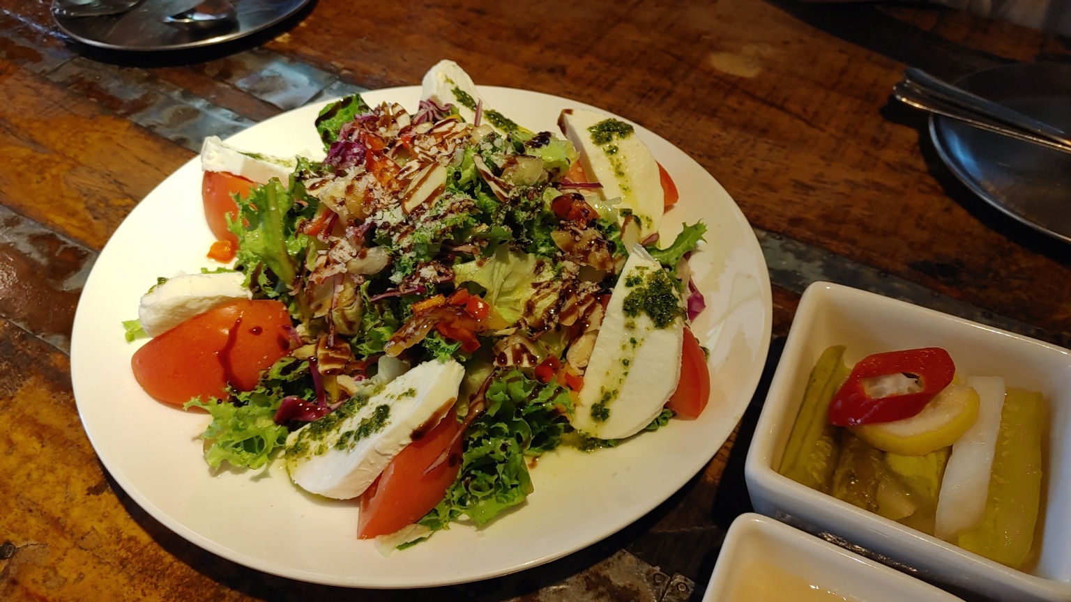 저희가 주문한 메뉴는 카프레제 샐러드, 고르곤졸라 피자, 안심 크림소스 스파게티, 해산물 토마토소스 스파게티랍니다.