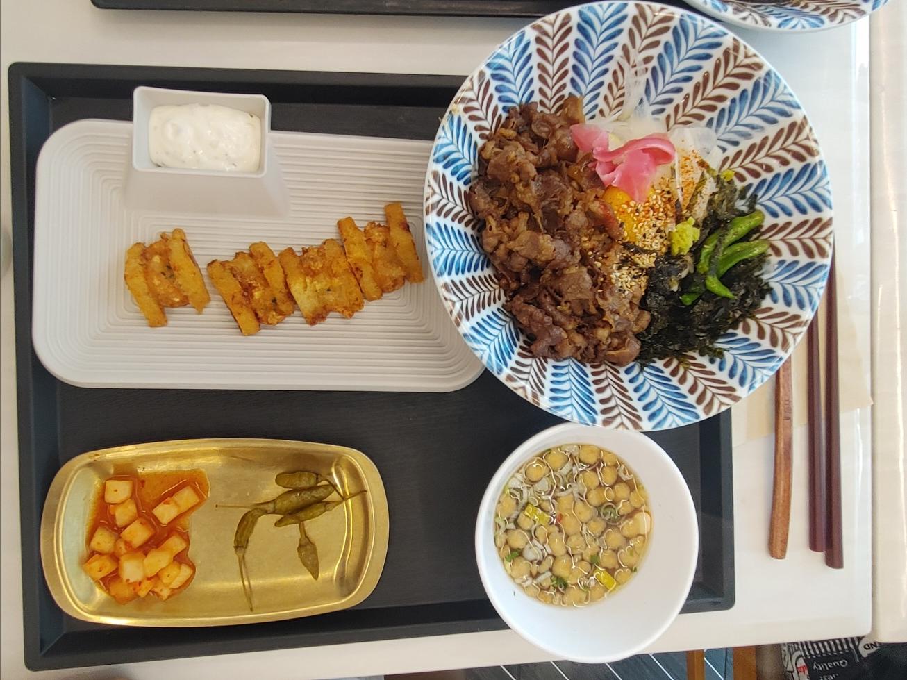 야끼규동 중간에 있는 노른자를 살짝 터뜨려 쓱싹쓱싹 비벼서 함께 먹어주면 진심 맛있어요!!