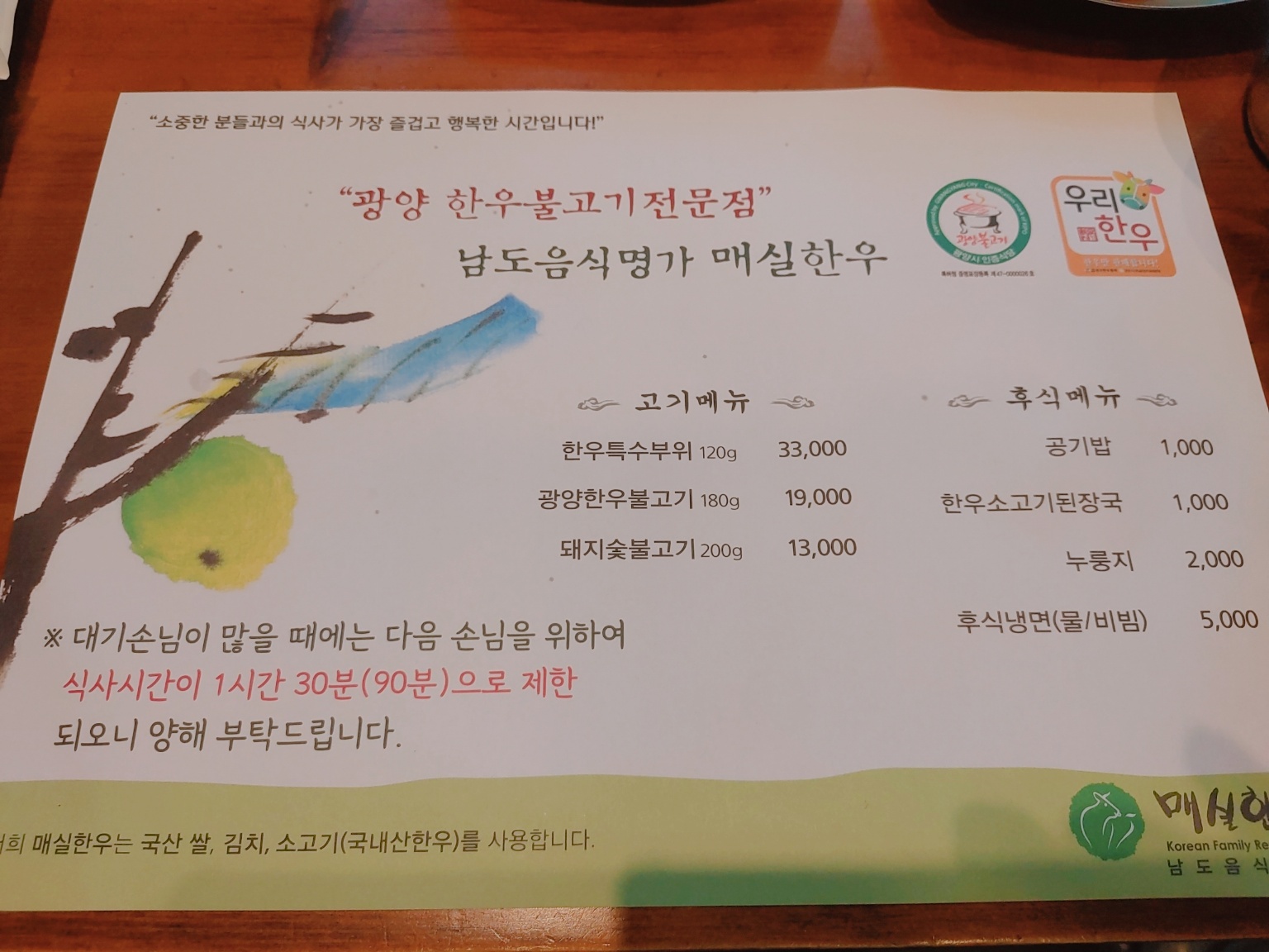 매실한우도 대기해서 먹는 맛집이라 그런지 손님이 많을 때는 식사시간제한이 있더라고요.