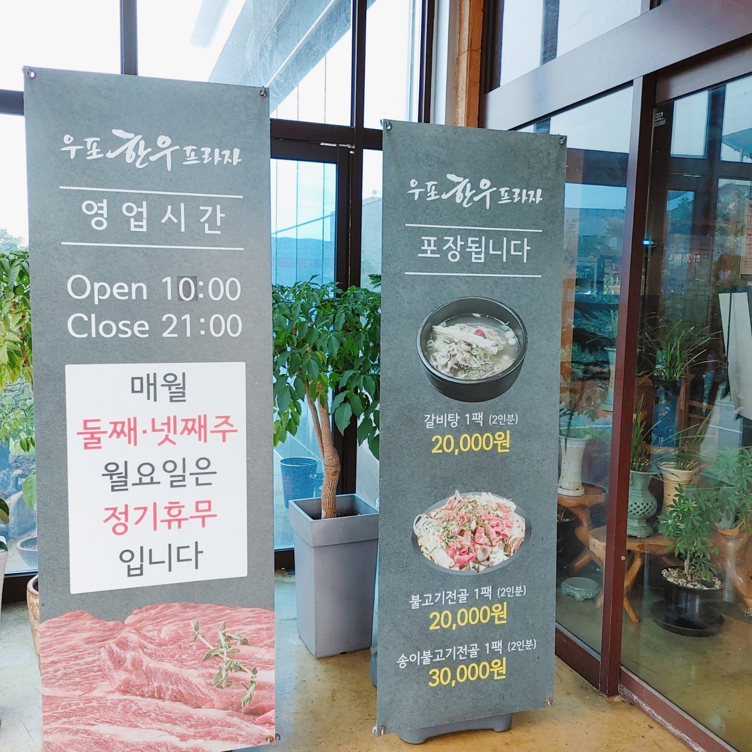 고깃집치고는 일찍 문을 닫더라고요. 저녁 9시까지 영업을 하고 매달 2,4번째 주 월요일은 정기휴무일이랍니다. 그리고 전 메뉴가 포장이 가능하더라고요.