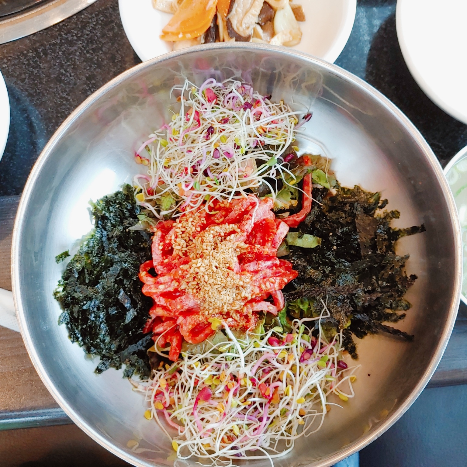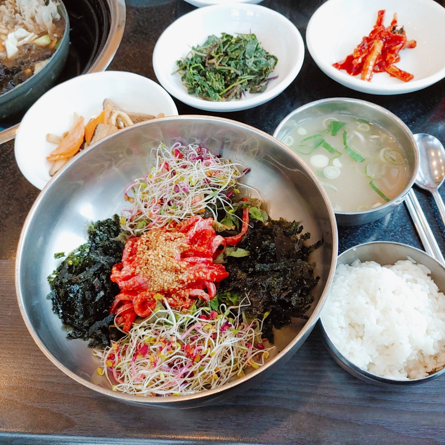한우육회비빔밥이랍니다. 국물과 밥이 같이 나와요. 초장과 참기름도 같이 챙겨준답니다. 집에 있는 참기름 생각하고 너무 많이 부었더니 조금 느끼했어요. 나의 실수 말고는 육회비빔밥도 담백하니 좋았답니다.