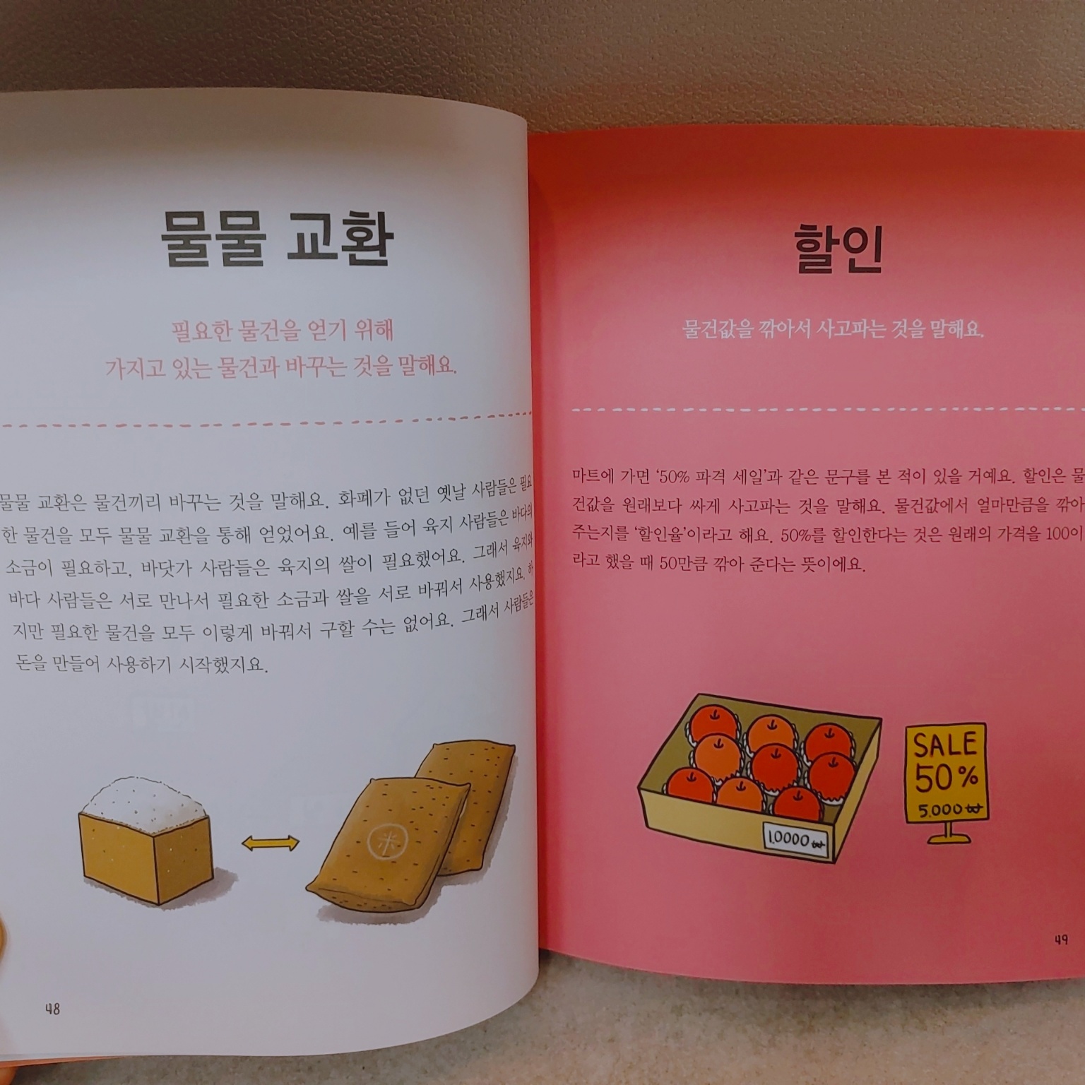 어른들은 쉽게 접하고 보는 단어이지만 아직 사회생활을 시작하기 전이 아이들에게는 접할 기회가 많이 없는 경제용어, 나는 무슨 뜻인지 알지만 아이들에게 설명이 어려울 때 큰 도움이 되더라고요. 아이들 수준에서 어떻게 설명해주어야 하는지도 알 수 있었답니다.