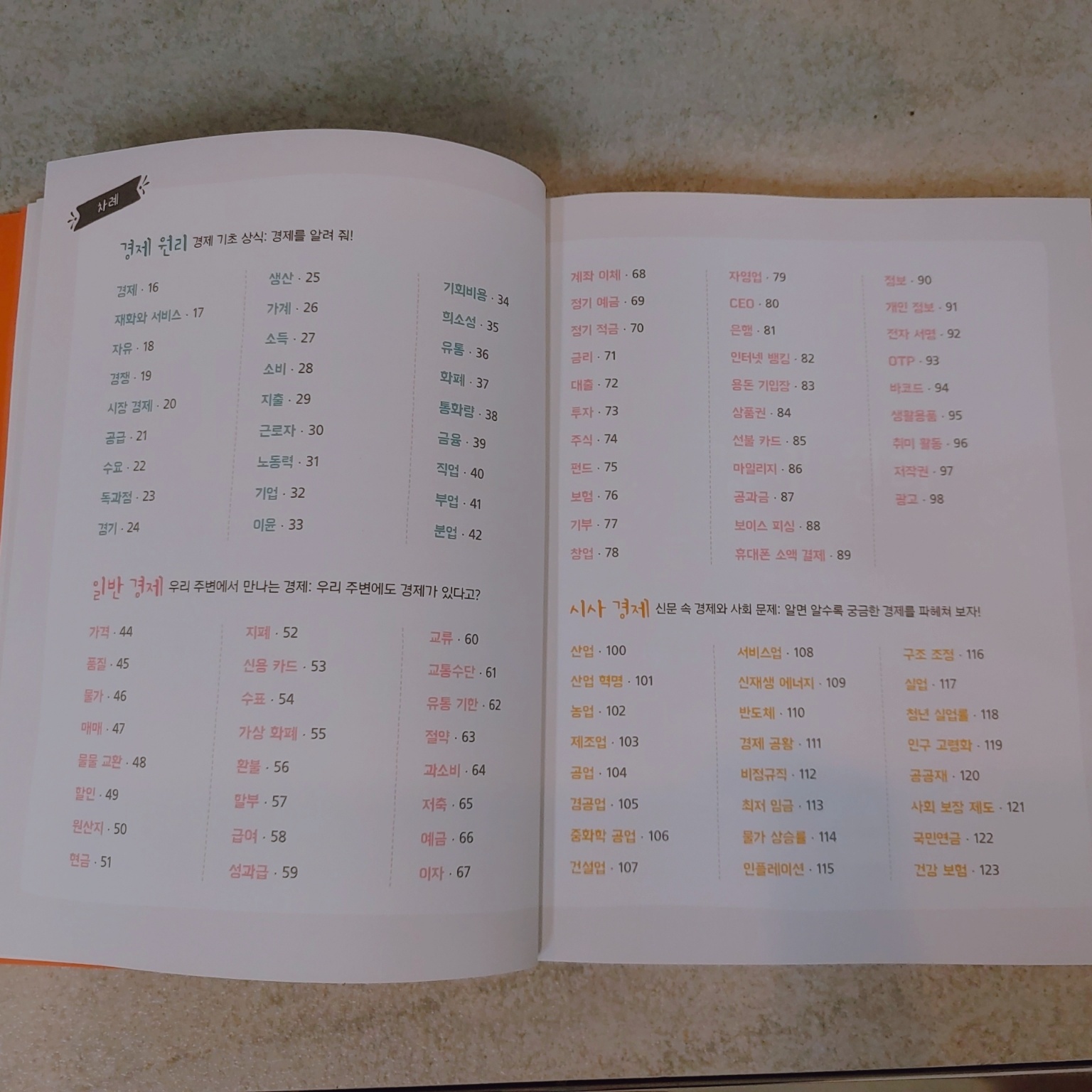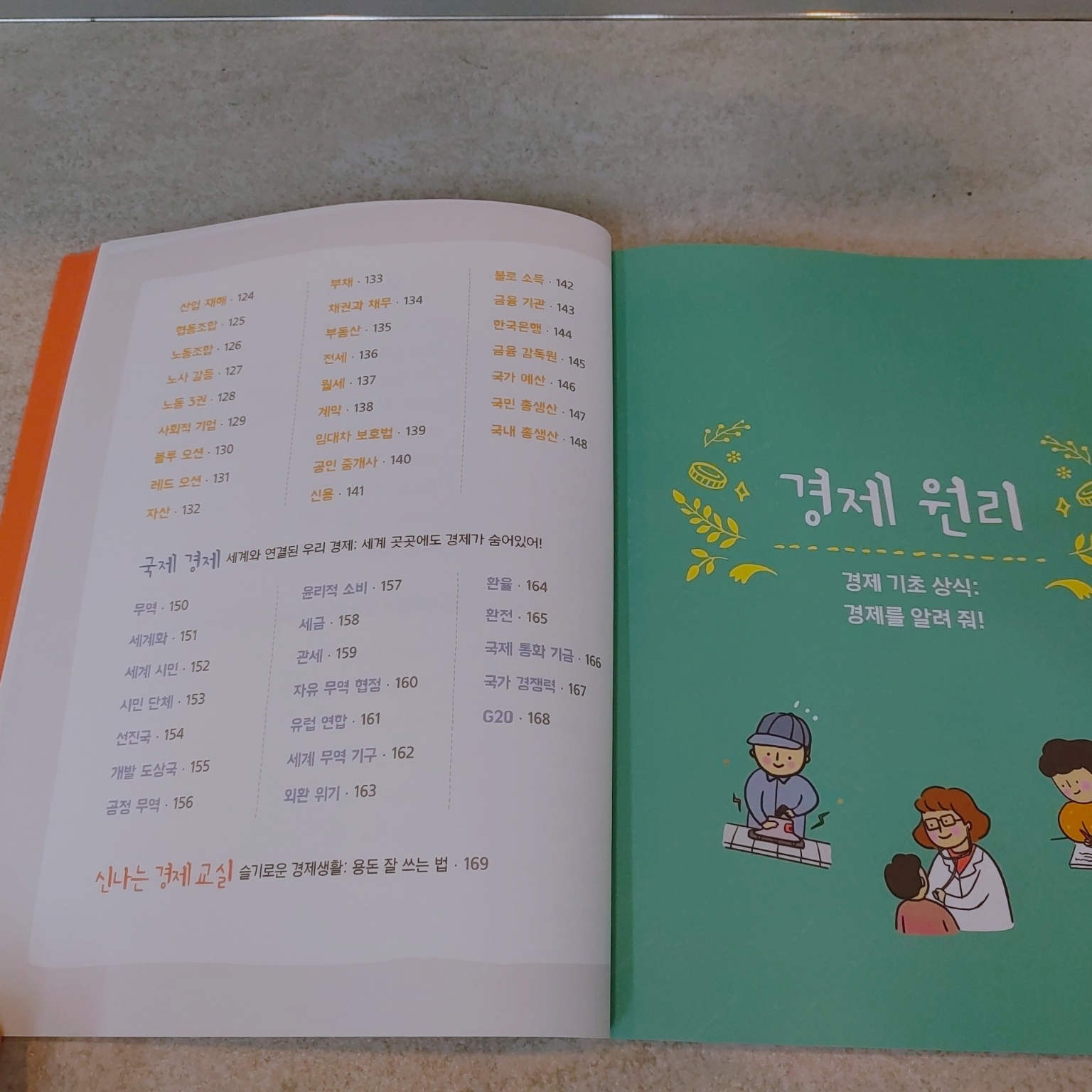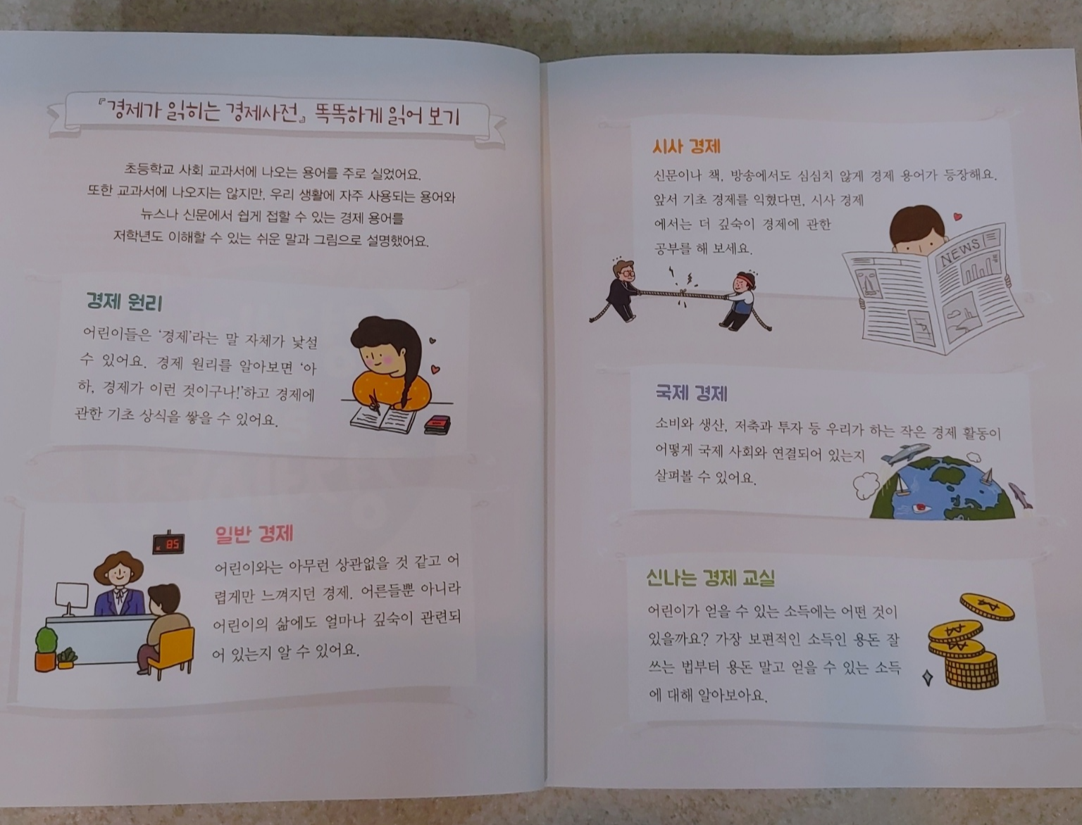 경제원리, 일반경제, 시사경제, 국제경제, 신나는 경제 교실로 단락이 나누어져 있답니다. 아직 저학년이 저희 아이가 아는 단어는 몇 없지만 평소에 들어본 단어들에는 관심을 보이면서 열심히 읽더라고요.