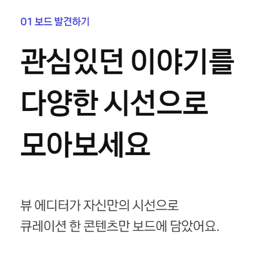 사용자는 '보드'를 통해 서비스 단위로 쪼개진 콘텐츠를 맥락 없이 소비하는 게 아니라, 하나의 주제를 담은 콘텐츠를 알차게 소비할 수 있습니다.
