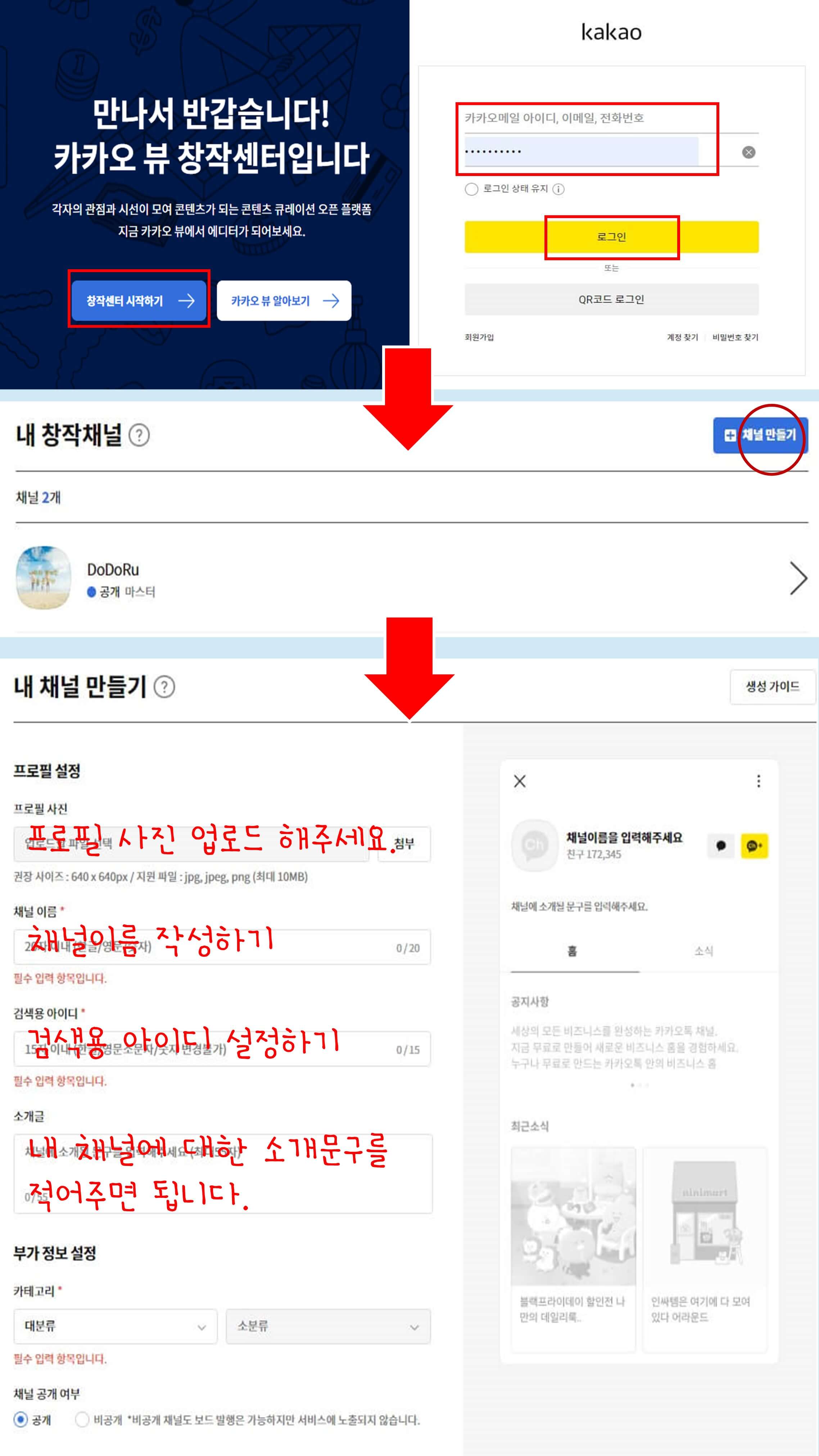 카카오뷰 창작 센터에 접속 → 카카오톡 아이디로 로그인 → 채널 만들기 선택 → 프로필 사진, 채널이름, 아이디, 소개글작성 → 채널개설하기