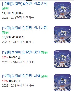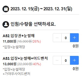 네이버 예매로 판매를 시작했답니다. 12월 티켓이 판매 중이에요!! 종류가 여러 가지이니 이용하고 싶은 것을 예약하시면 될 것 같아요.