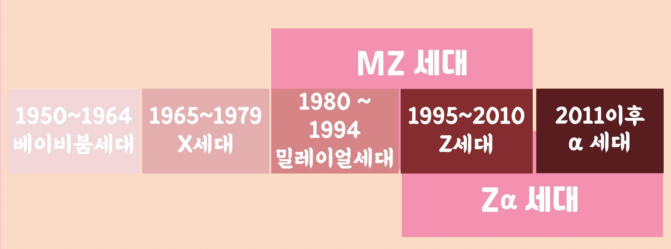 MZ 세대는 1980년대부터 2010년 사이에 태어난 사람들을 일컫는 단어예요. Millennial의 약자 M과 Generation Z의 약자 Gen Z를 붙여서 MZ세대라고 불러요.